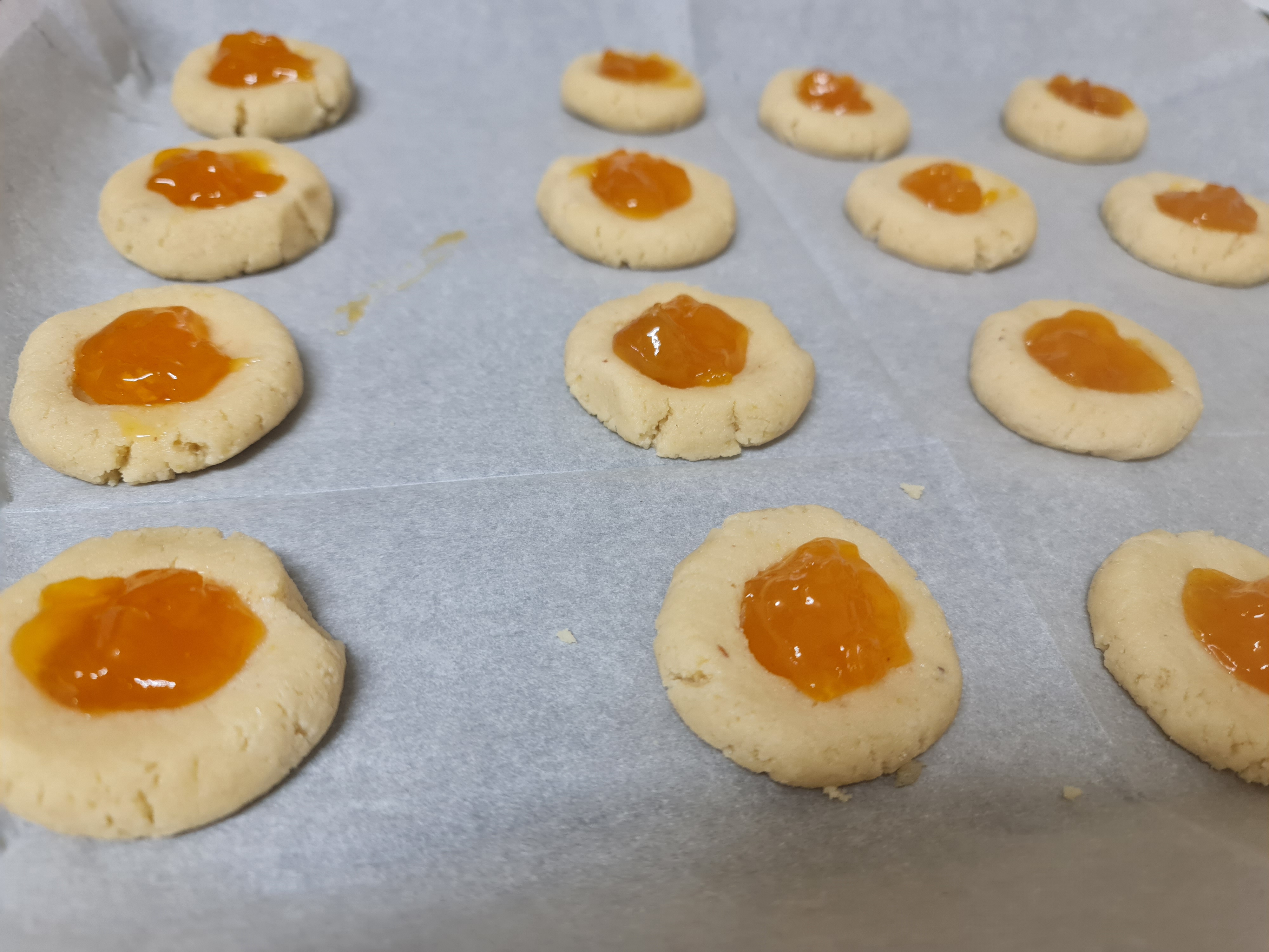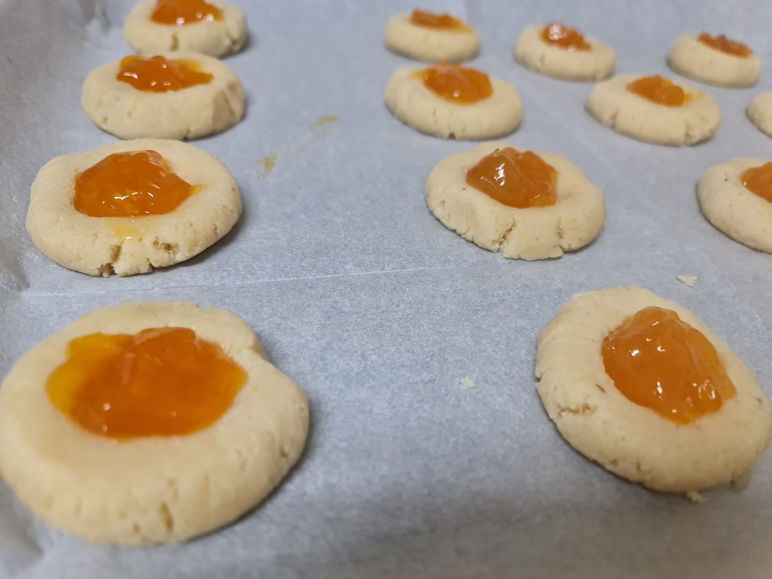 Déposez au creux de chaque biscuit une belle cuillère de confiture et enfournez pendant 15/ 20 minutes jusqu’à obtenir une jolie couleur dorée.