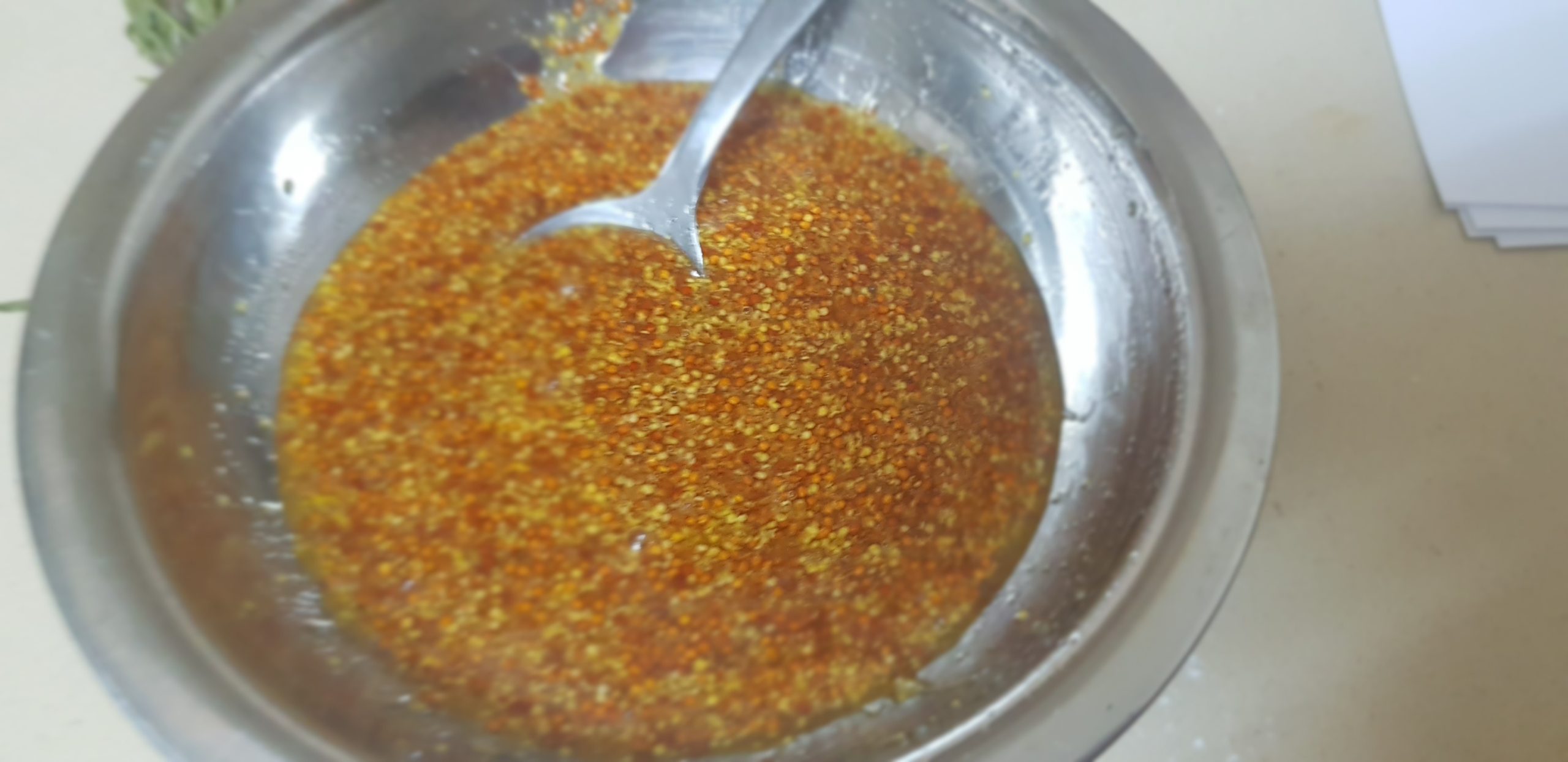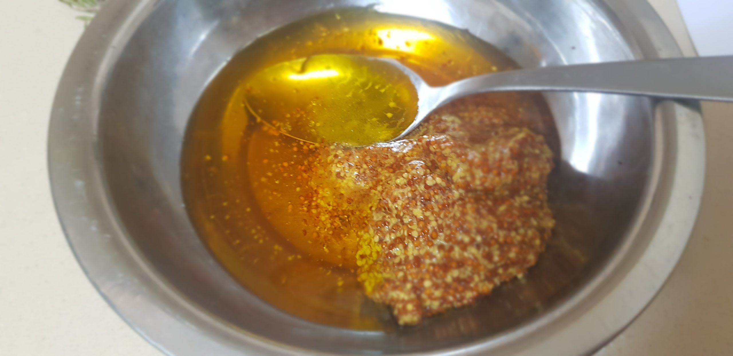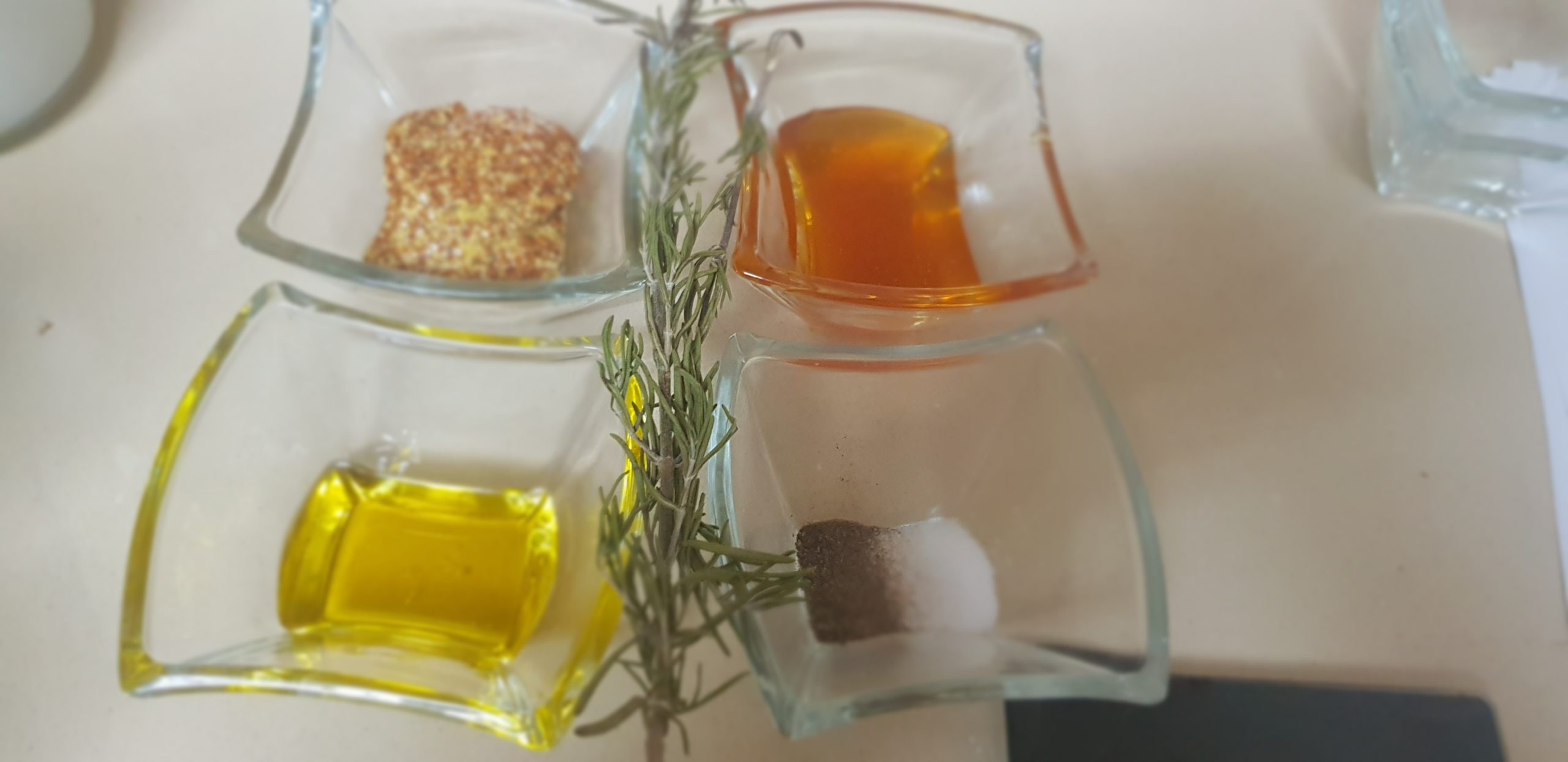 Dans un bol, mélangez à l’aide d’un fouet la moutarde, le miel et l’huile d’olive. Ajoutez une pincée de sel