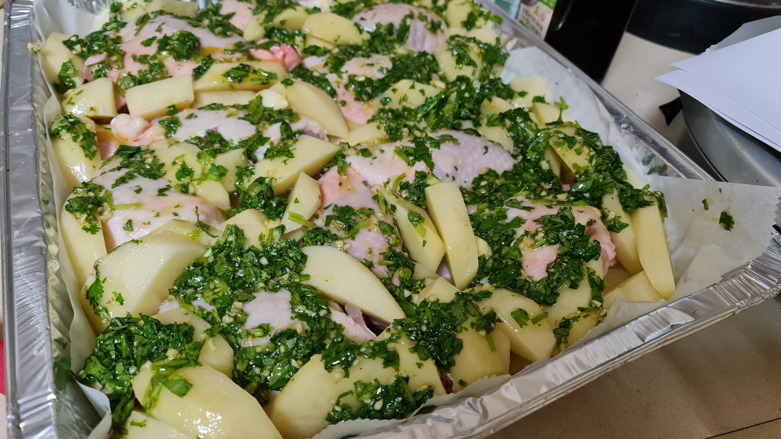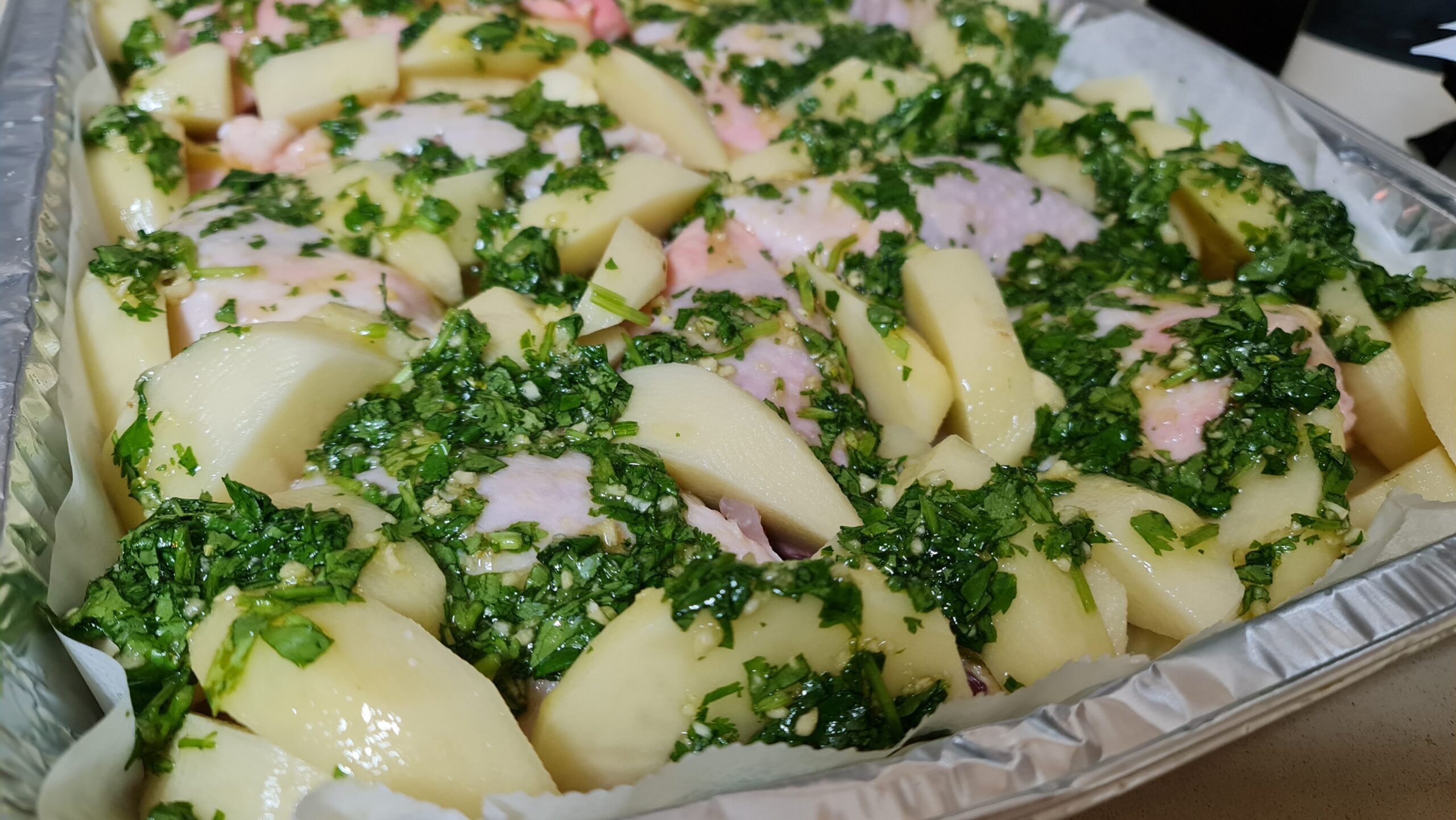 Couvrir le poulet et les pommes de terre avec du papier sulfurisé humide et placer une feuille d’aluminium sur le dessus et sceller le moule.