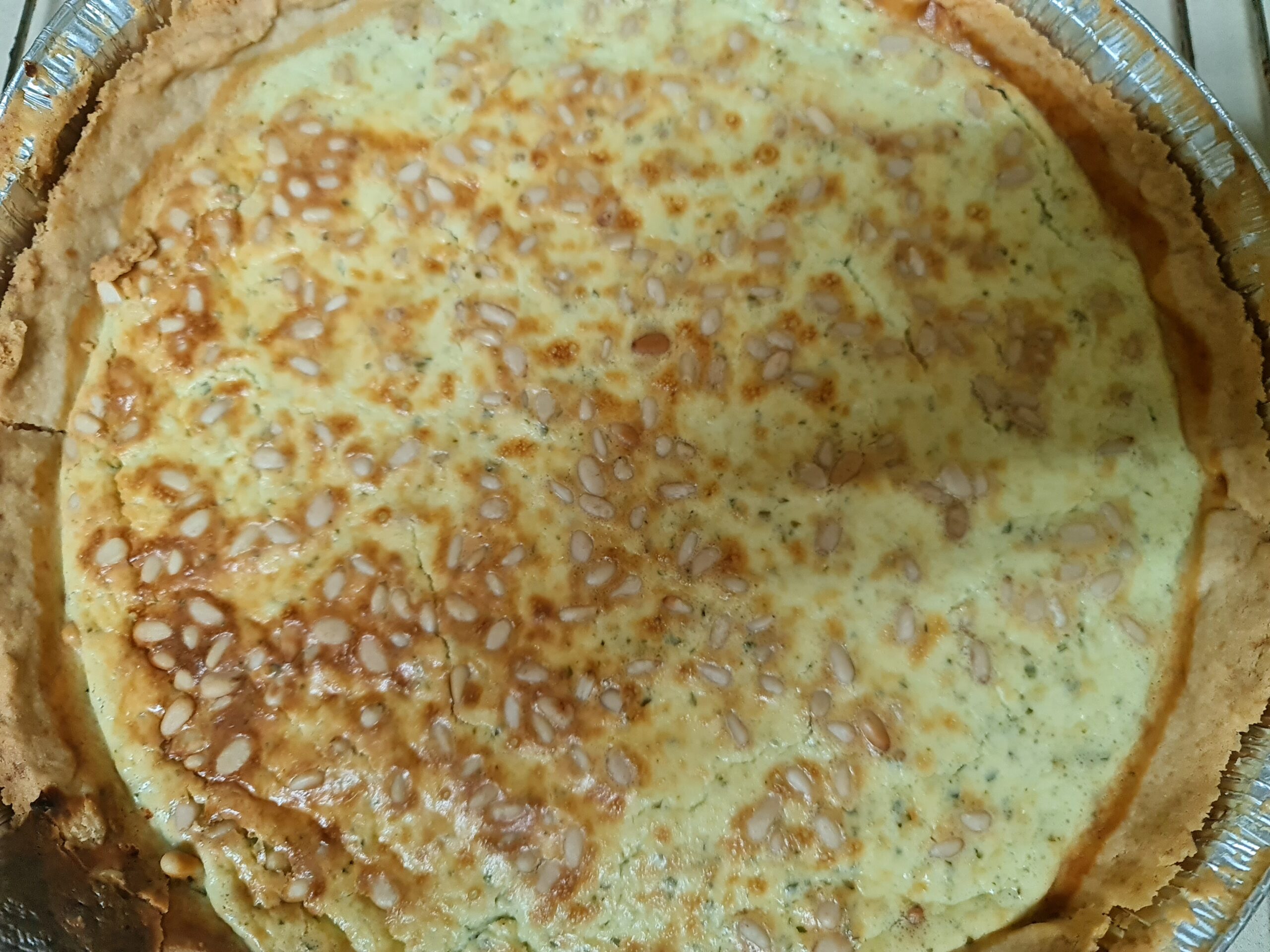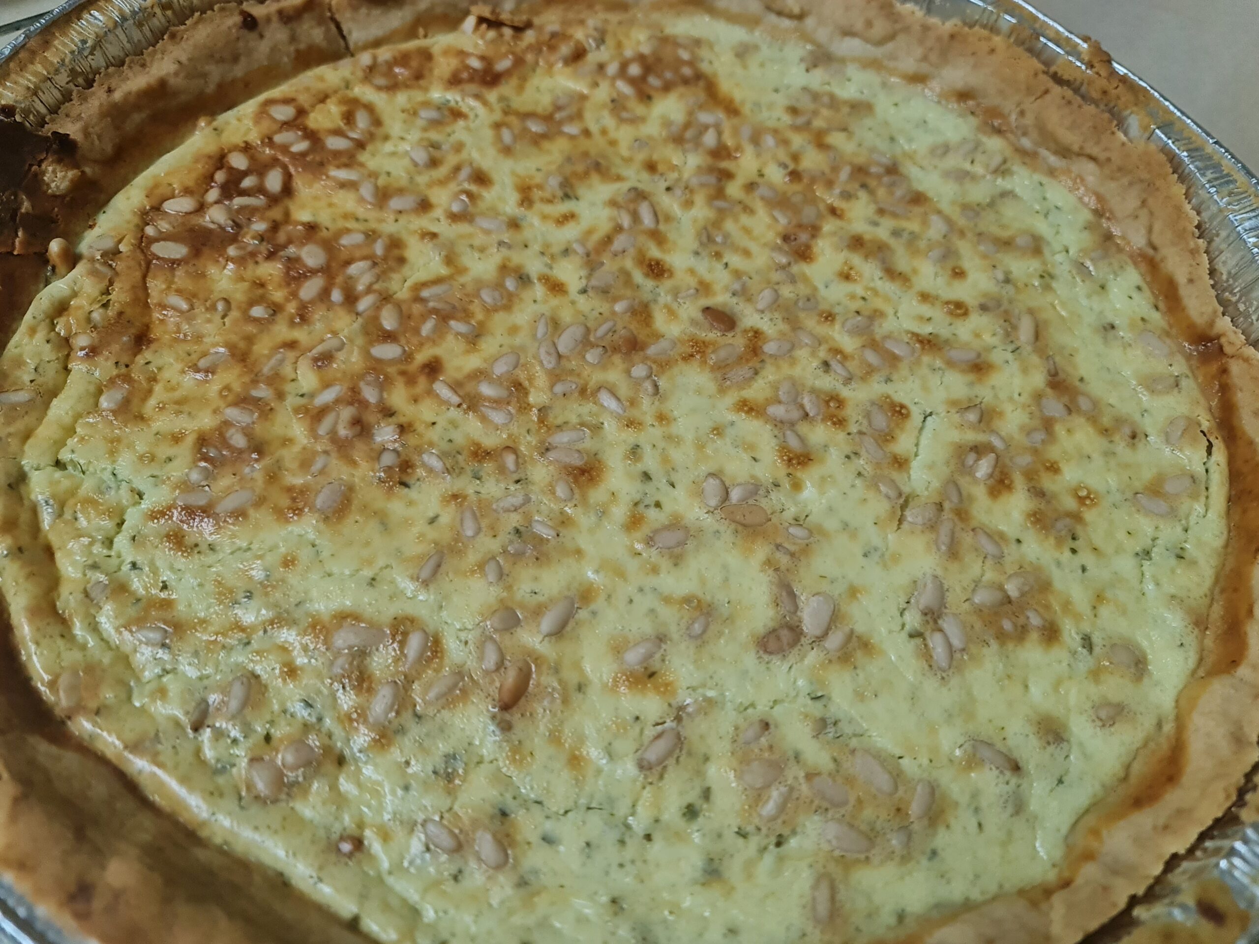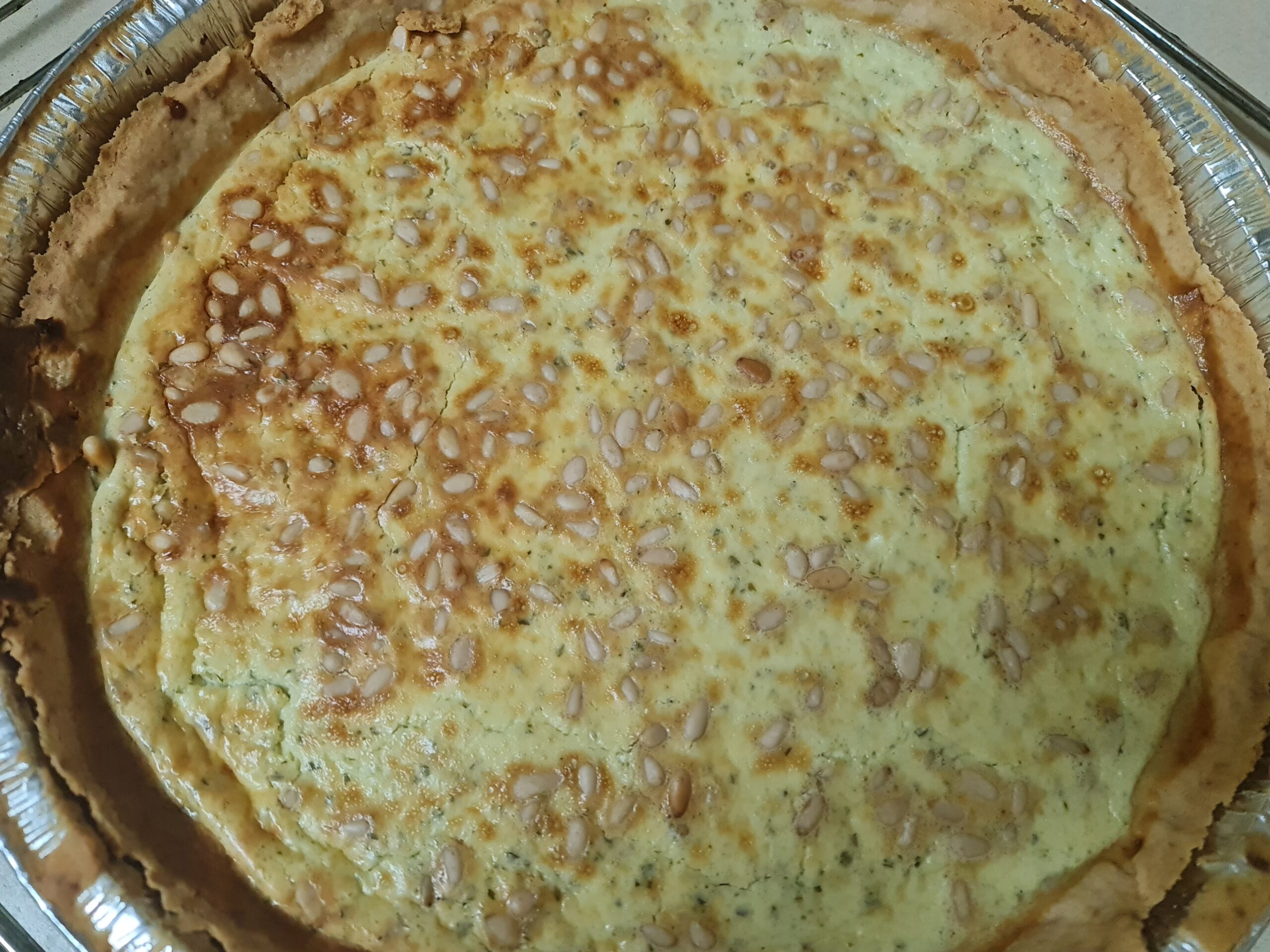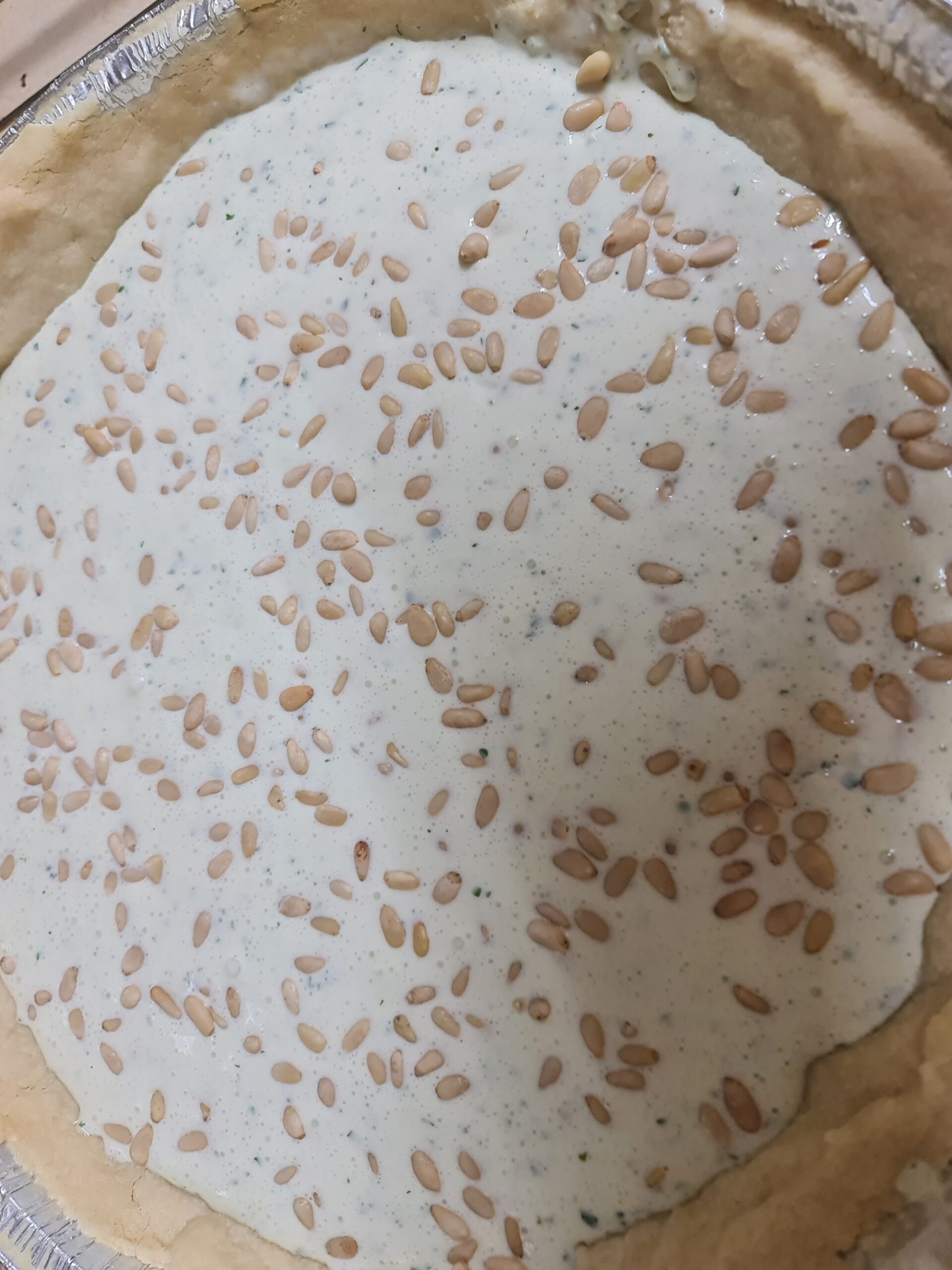 Et pour le dernier ingrédient – les pignons de pin – saupoudrer joliment sur la quiche. Enfourner la quiche environ une demi-heure (parfois un peu plus selon les fours) jusqu’à ce qu’elle soit dorée et parsemée. Retirer, laisser refroidir .