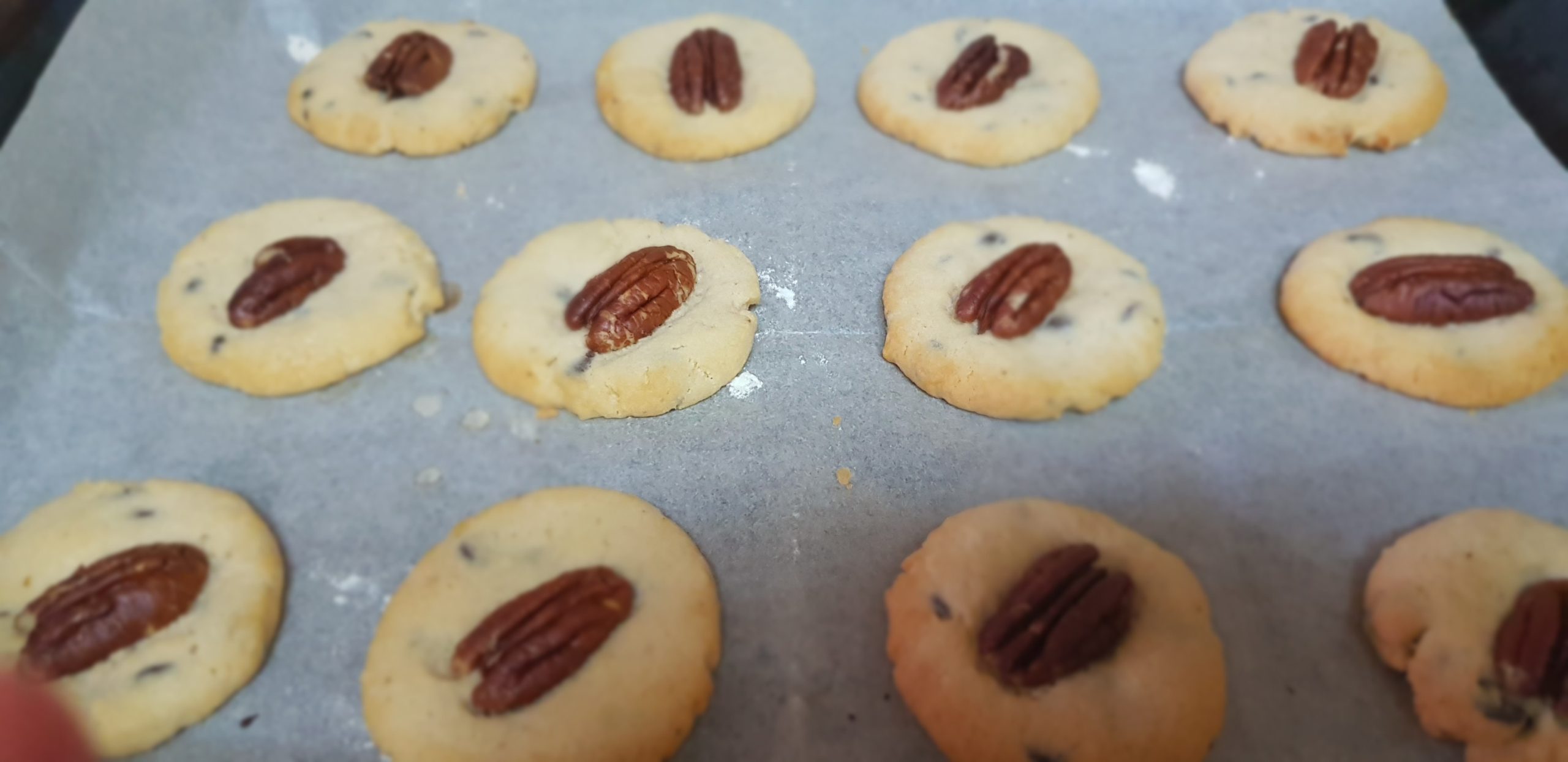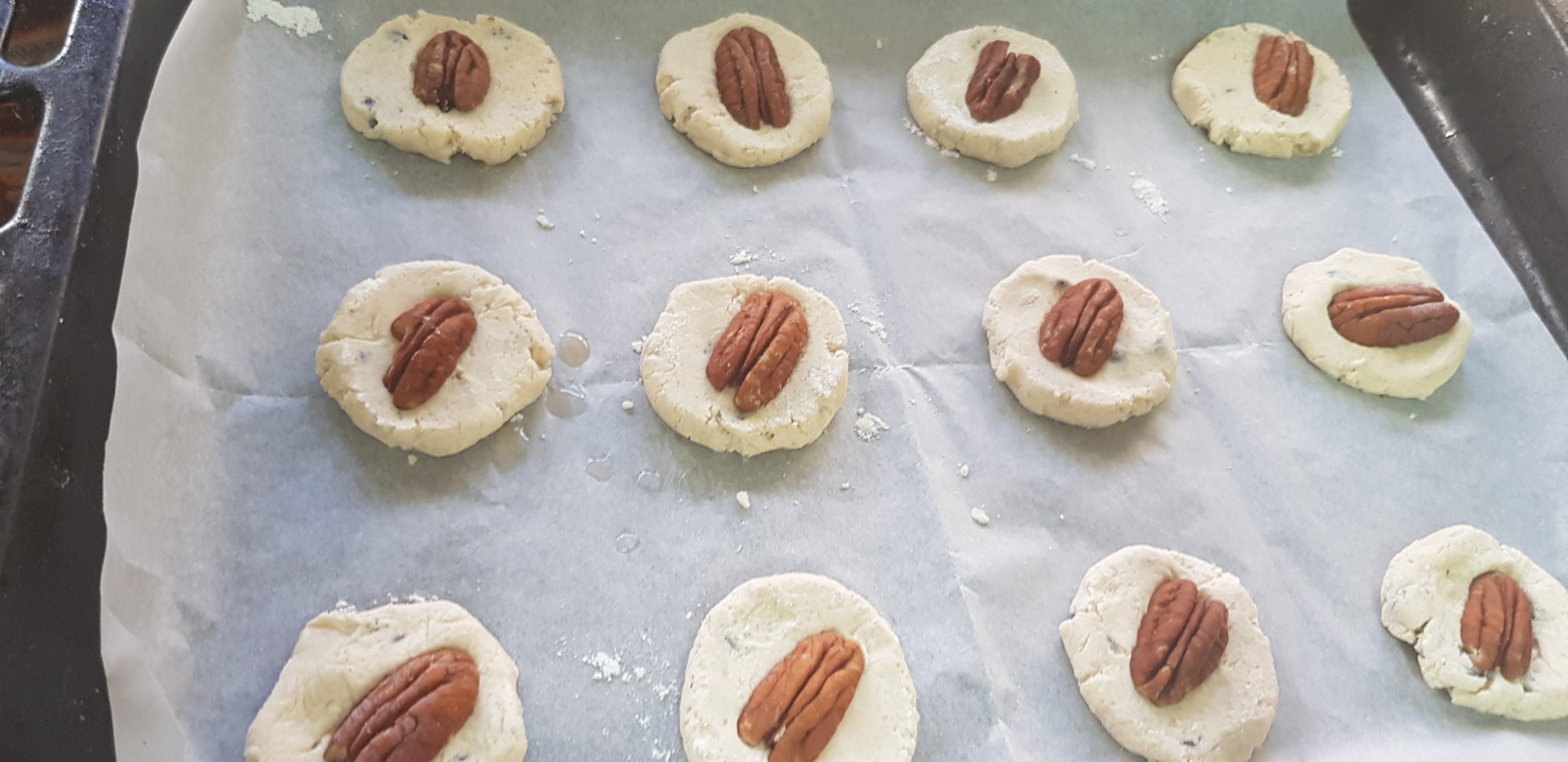 5. Façonner la pâte à biscuits en boules. Disposer sur une plaque à pâtisserie, aplatir les biscuits avec une cuillère et cuire au four environ 15 minutes, jusqu’à ce qu’ils soient dorés sur les bords.
