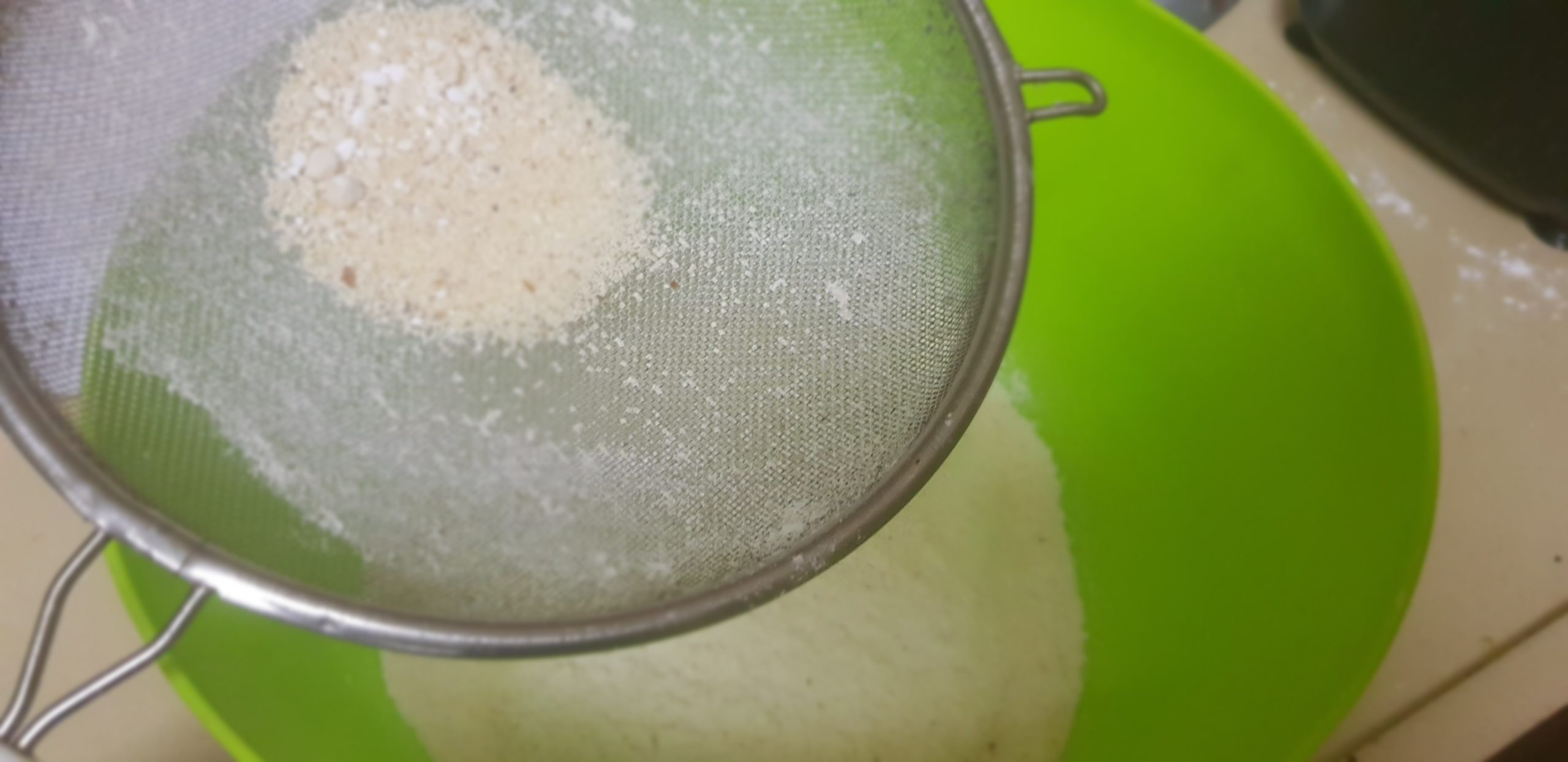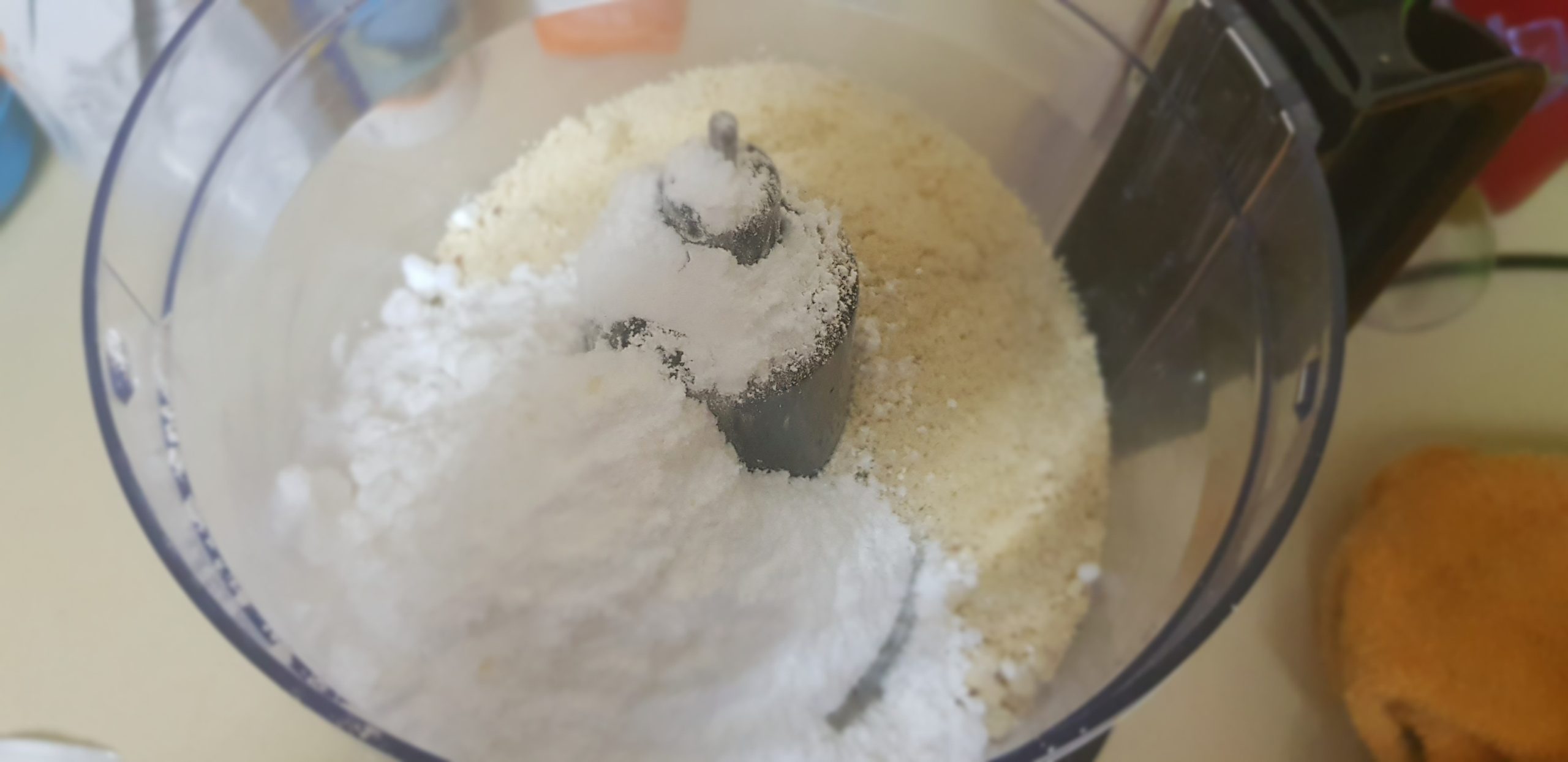 1- Mettre le sucre glace et l’amande moulue dans le robot culinaire et mélanger jusqu’à ce qu’ils soient très fins. Tamisez le mélange de farine et d’amande à travers un tamis à mailles fines dans un grand bol et jetez les plus gros grumeaux. Mettre de côté.