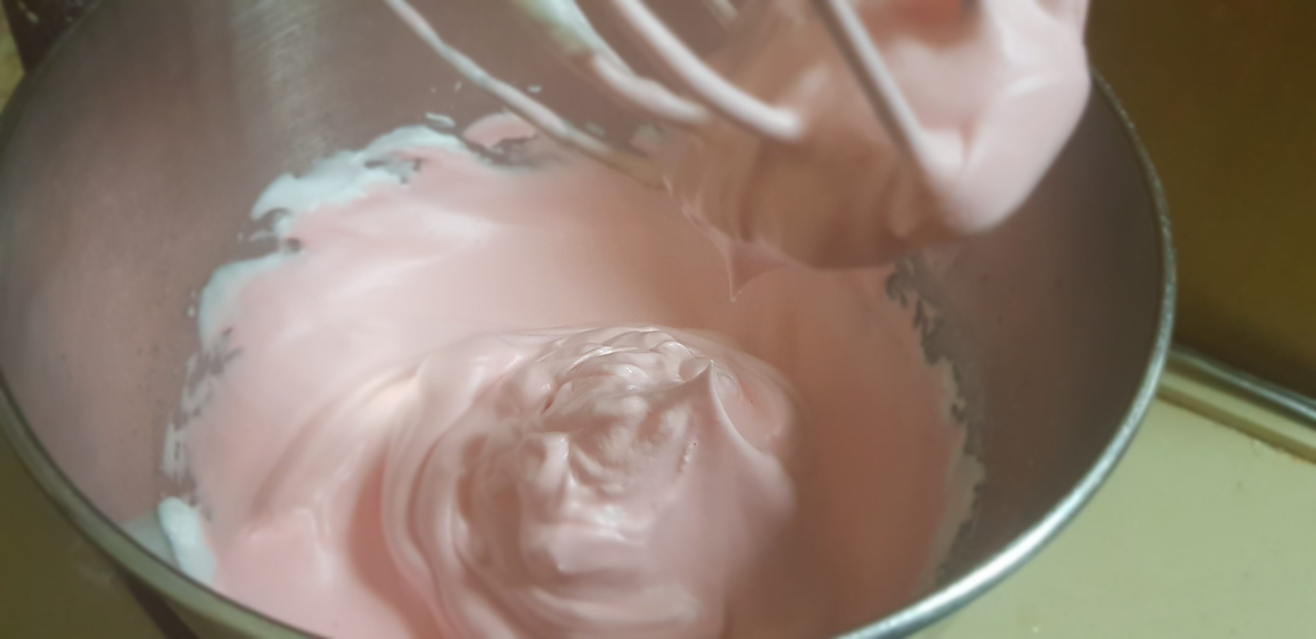 2 – Dans un autre grand bol, battre les blancs d’œufs avec une pincée de sel jusqu’à formation de pics mous. Ajouter progressivement le sucre granulé jusqu’à ce qu’il soit complètement incorporé. Continuez à battre jusqu’à la formation de pics fermes. Ajouter le colorant alimentaire et battre jusqu’à ce que le mélange et la couleur aient changé.