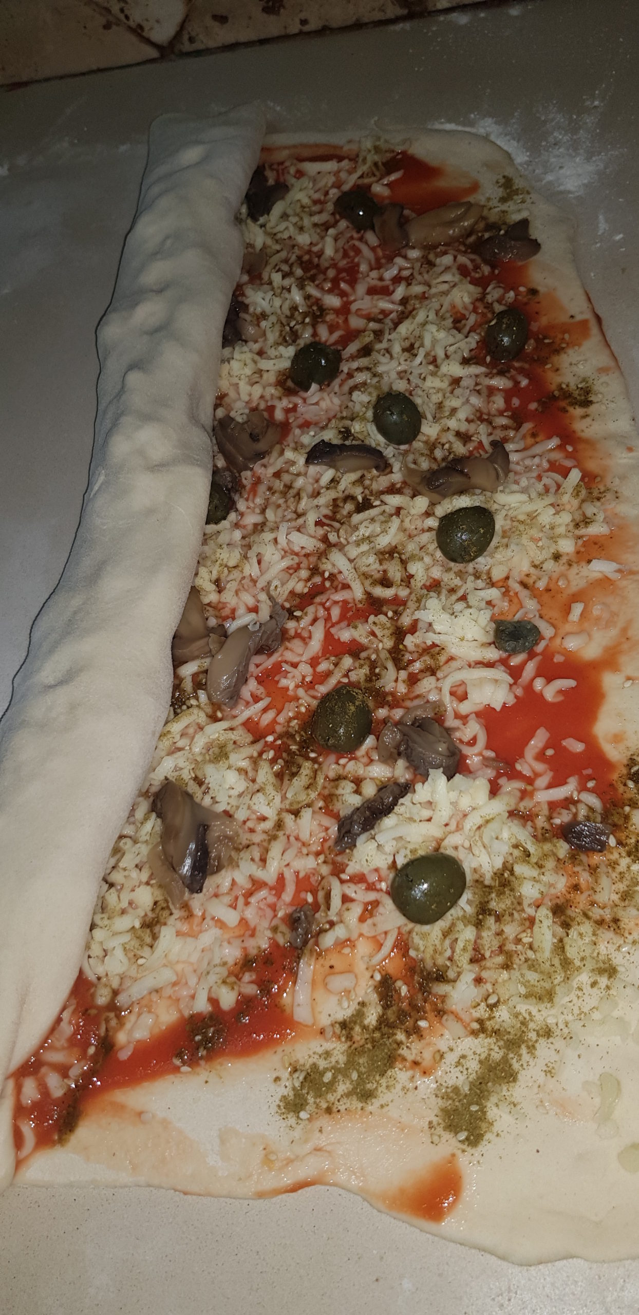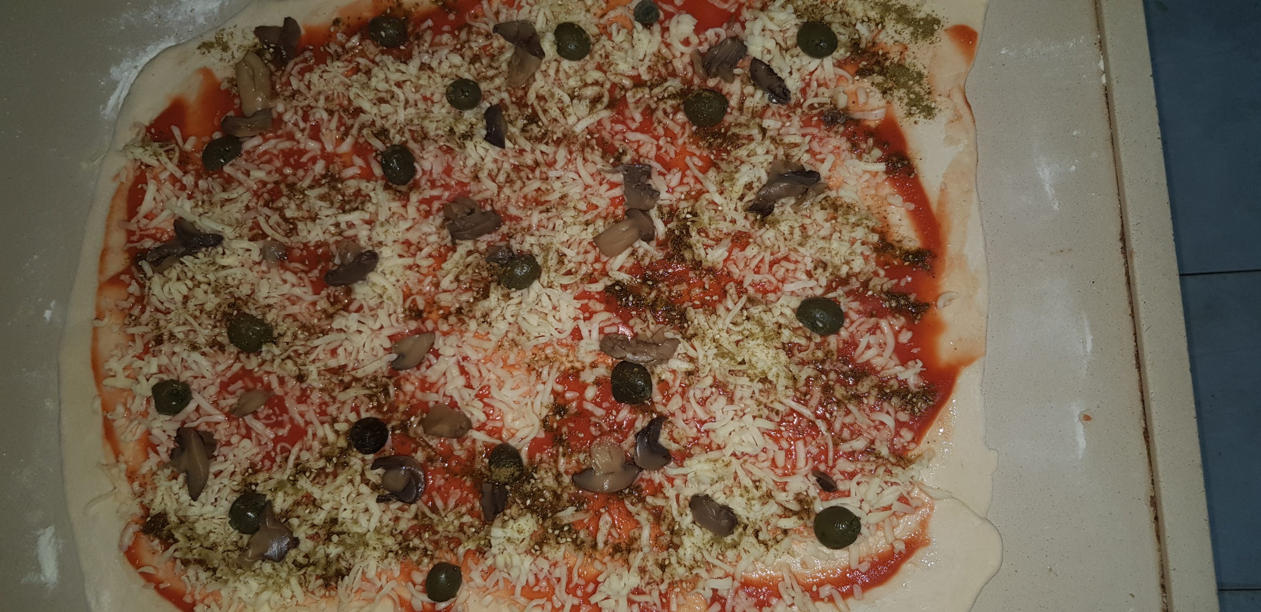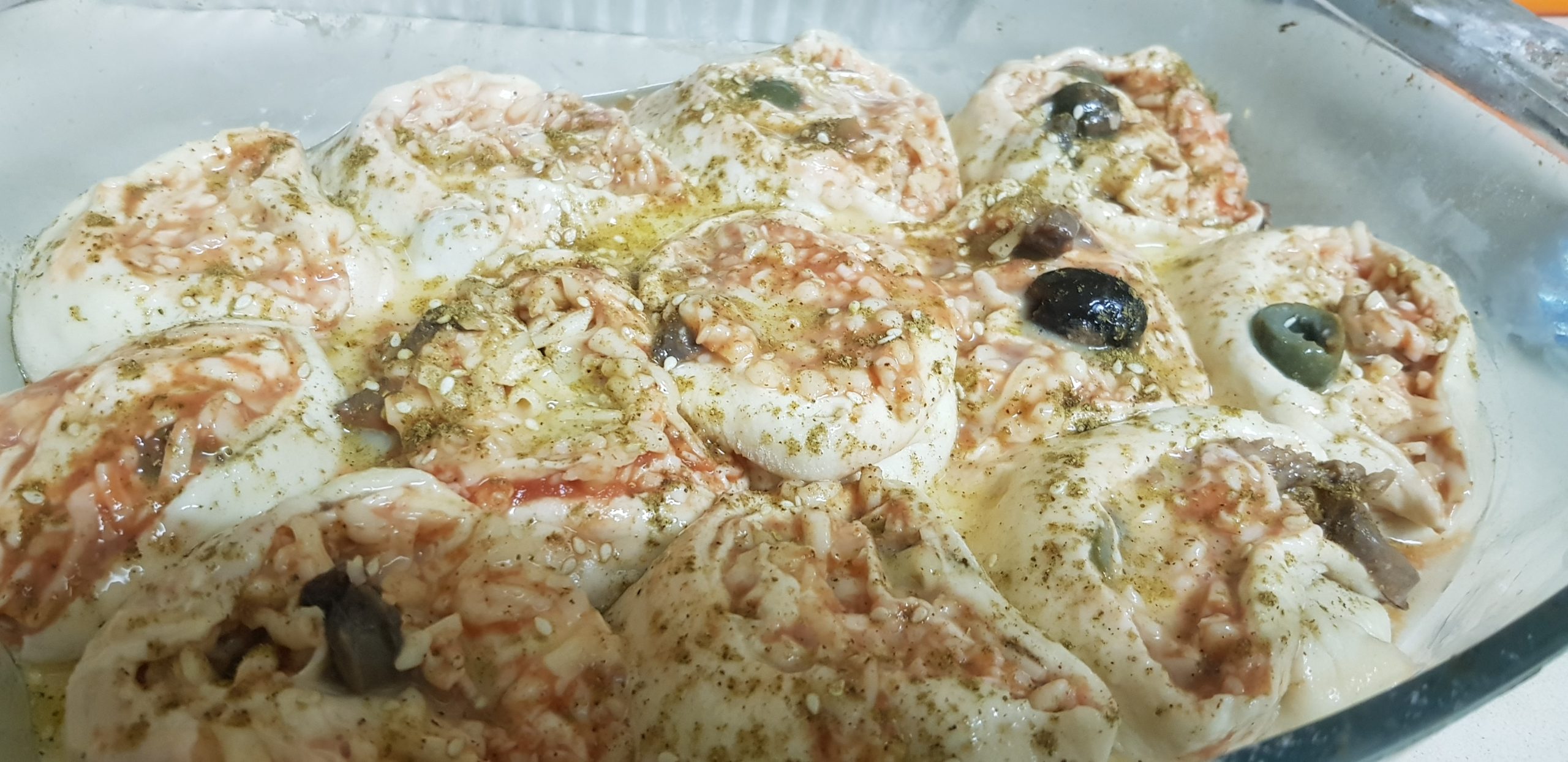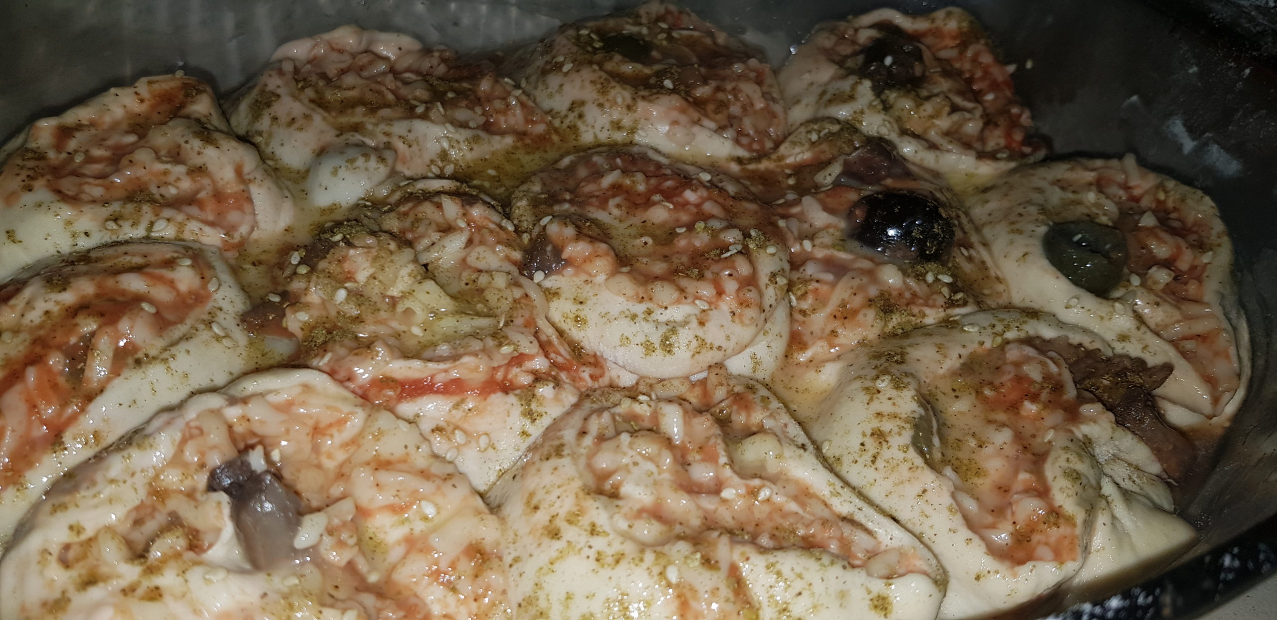 4. Tartiner de la sauce tomate, l’ail écrasé et saupoudrer d’origan. Saupoudrez ensuite de mozzarella et d’olives (facultatif). Laisser environ 2 cm à découvert sur les bords.