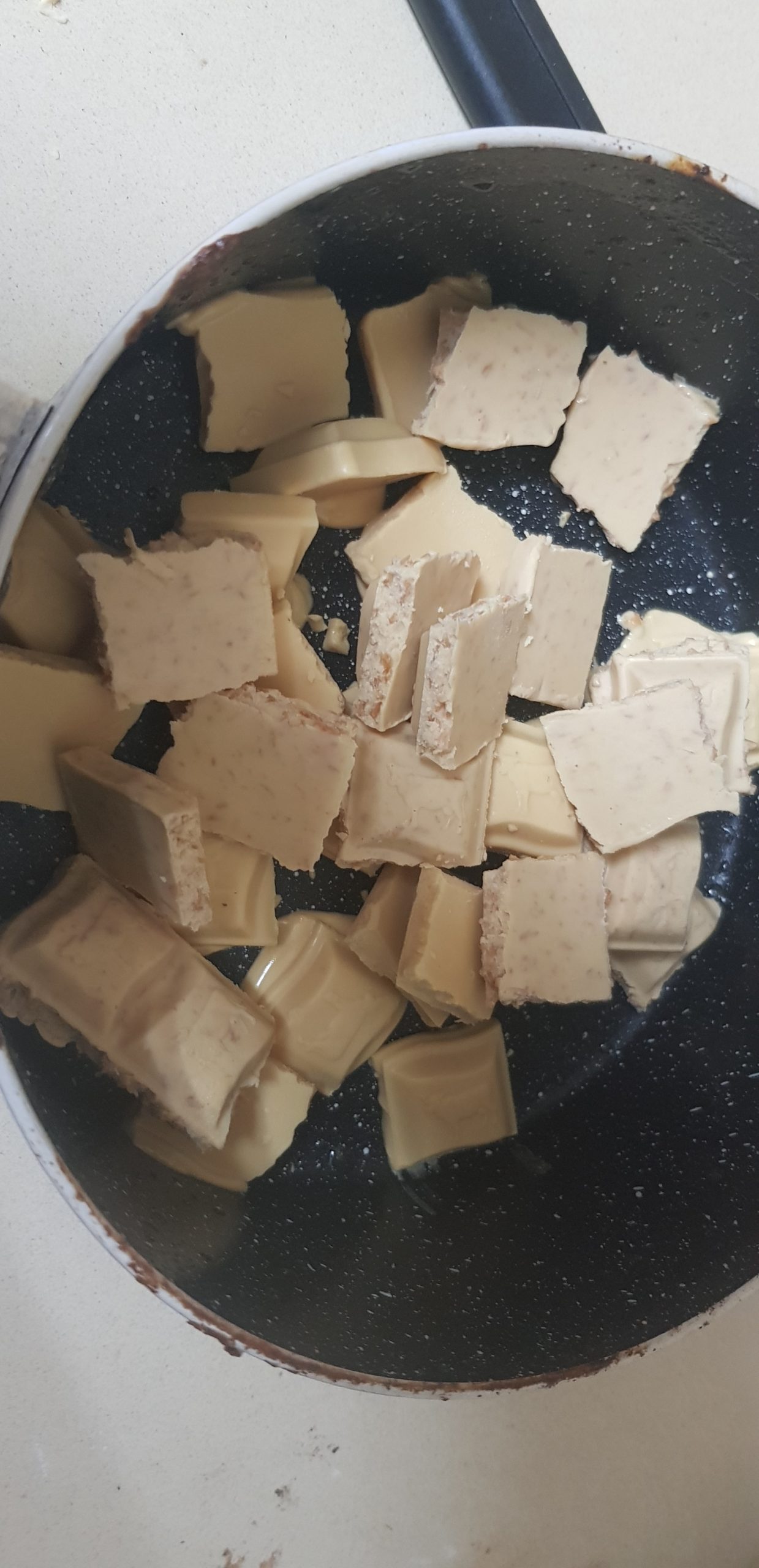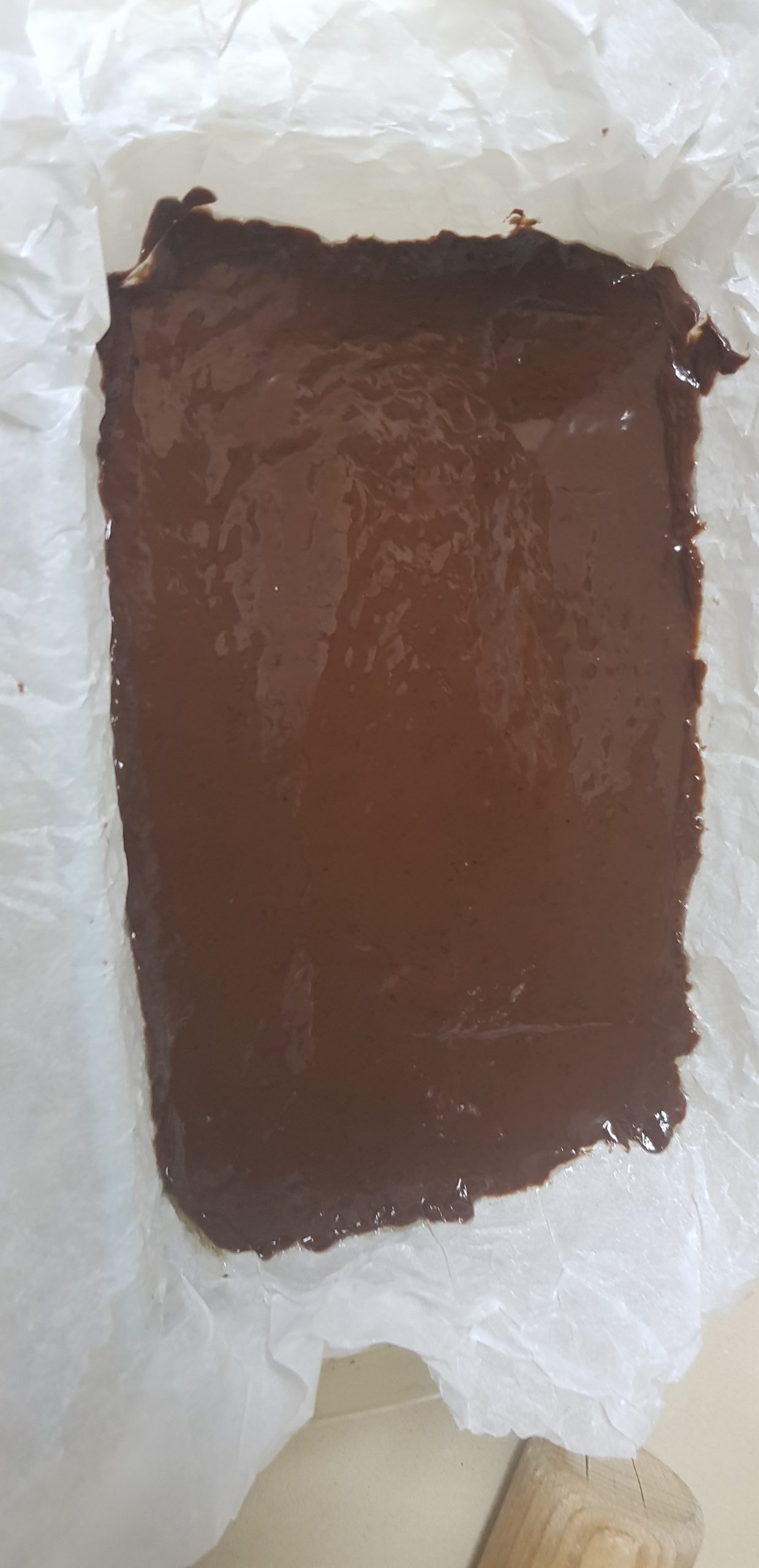 Faites fondre encore 150 g de chocolat au lait ordinaire (il en reste une moitié ), sortez le bol en pyrex du congélateur et versez le chocolat fondu sur le tout .. Aplatissez-le bien et uniformément .. et remettez-le au congélateur pour un autre 1/2 heure ou jusqu’à ce qu’il durcisse (il est important que pour la dernière fois le chocolat durci vraiment et attendre plus d’une demi-heure si rien ne se passe ?)