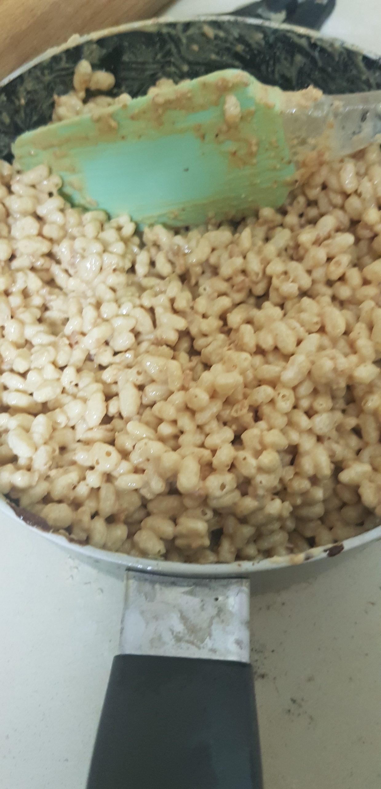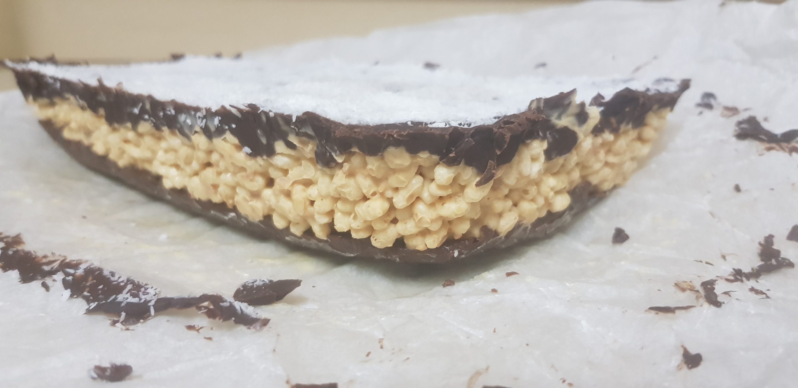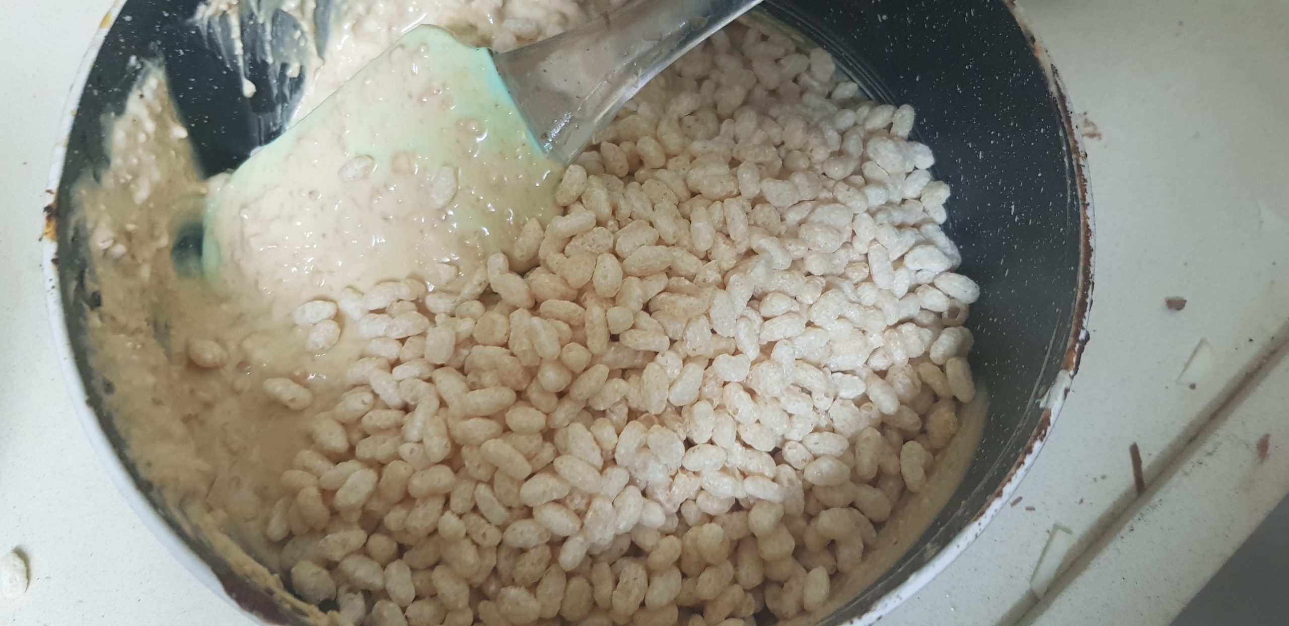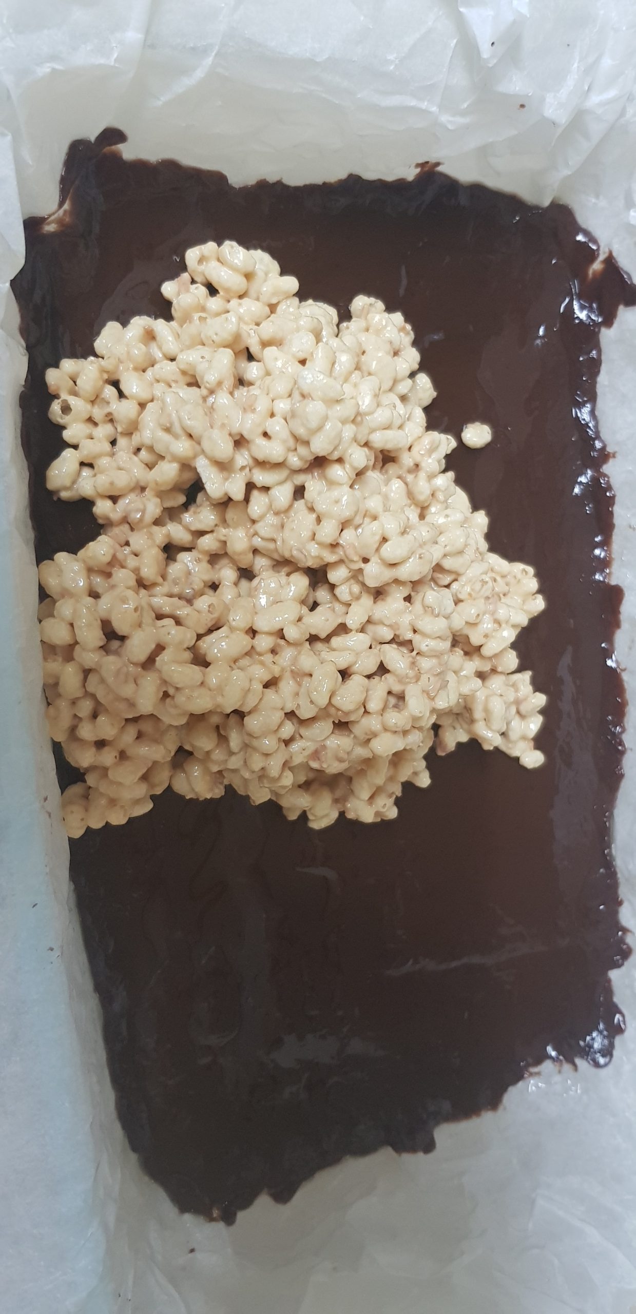 Retirer le plat du congélateur et verser le chocolat caramel et riz soufflé.. Aplatir bien, uniformément et mettre à nouveau au congélateur encore 1/2 heure ou jusqu’au durcissement