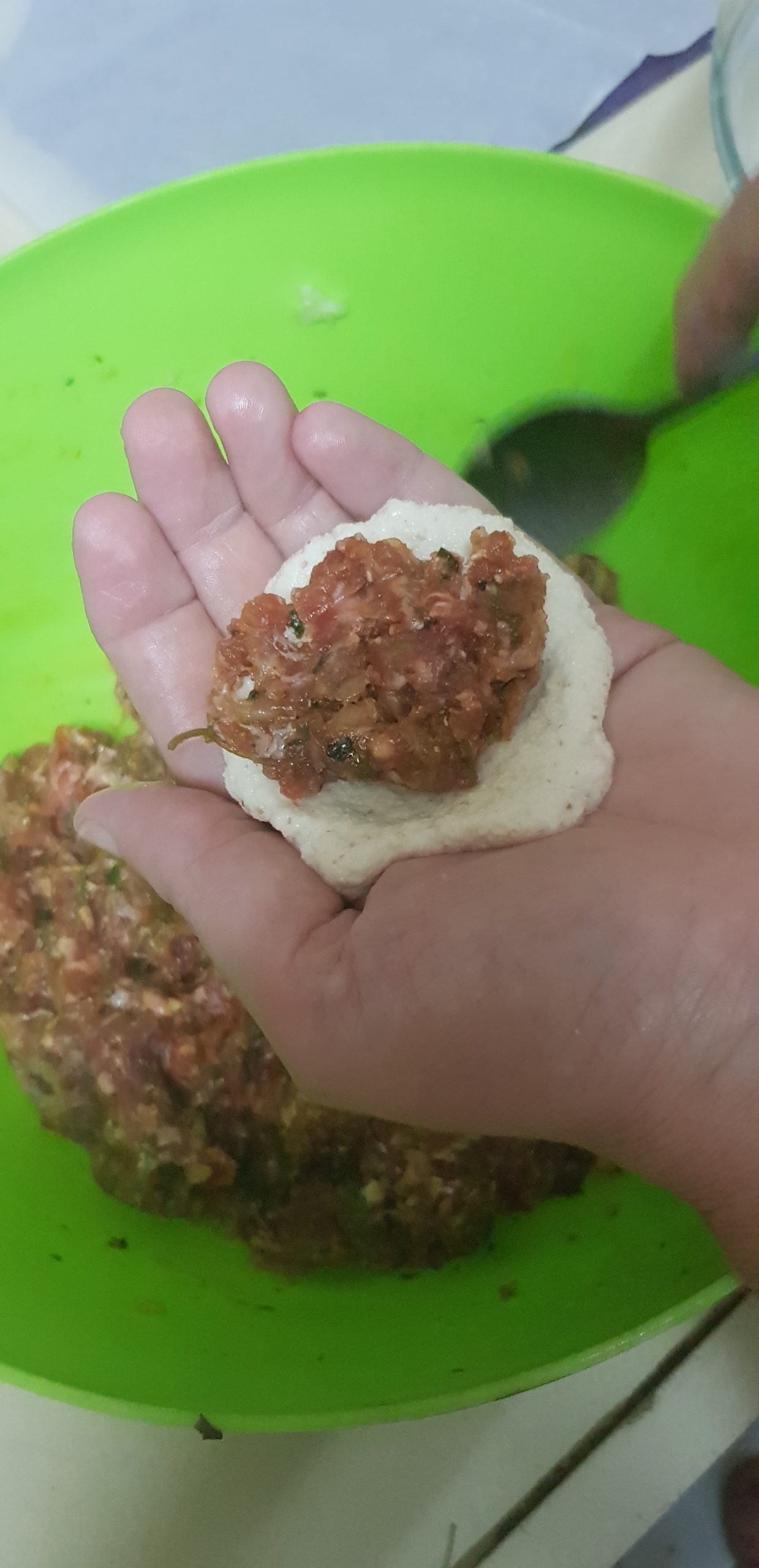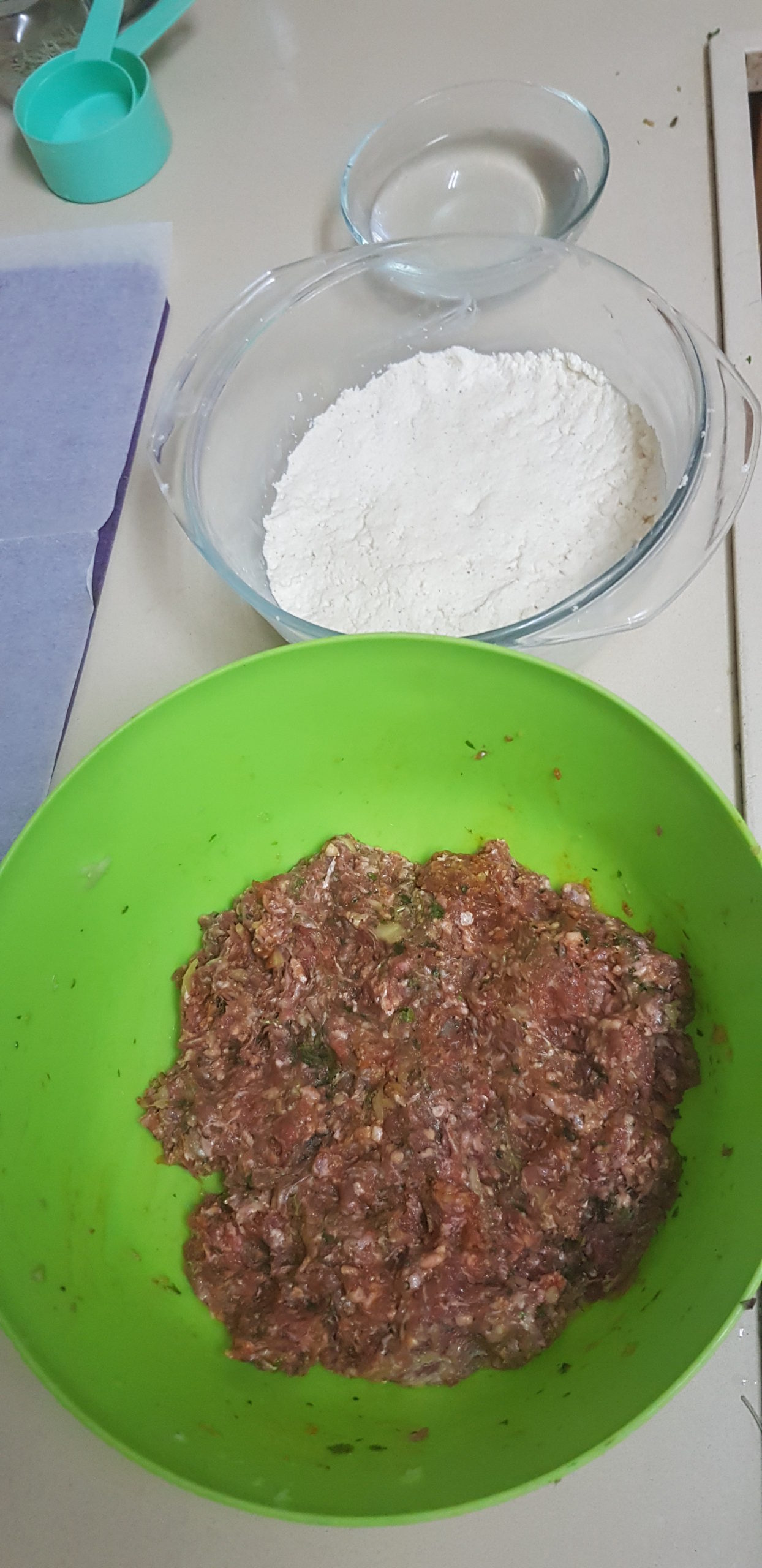 Pendant ce temps, préparez le mélange de viande : dans un grand bol, placez la viande, l’oignon haché, le persil haché, l’huile et les épices. Bien mélanger jusqu’à ce que tout soit combiné.