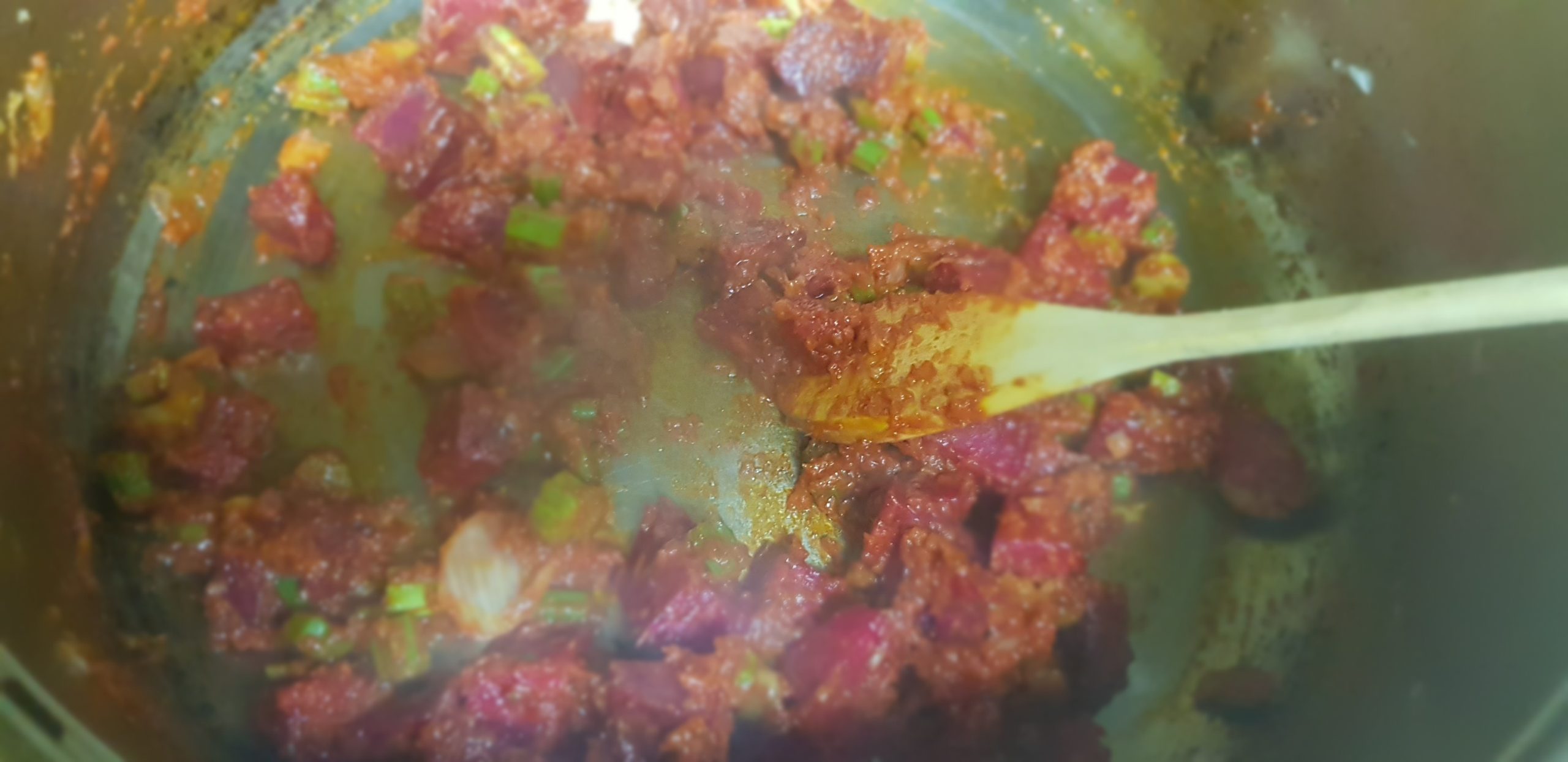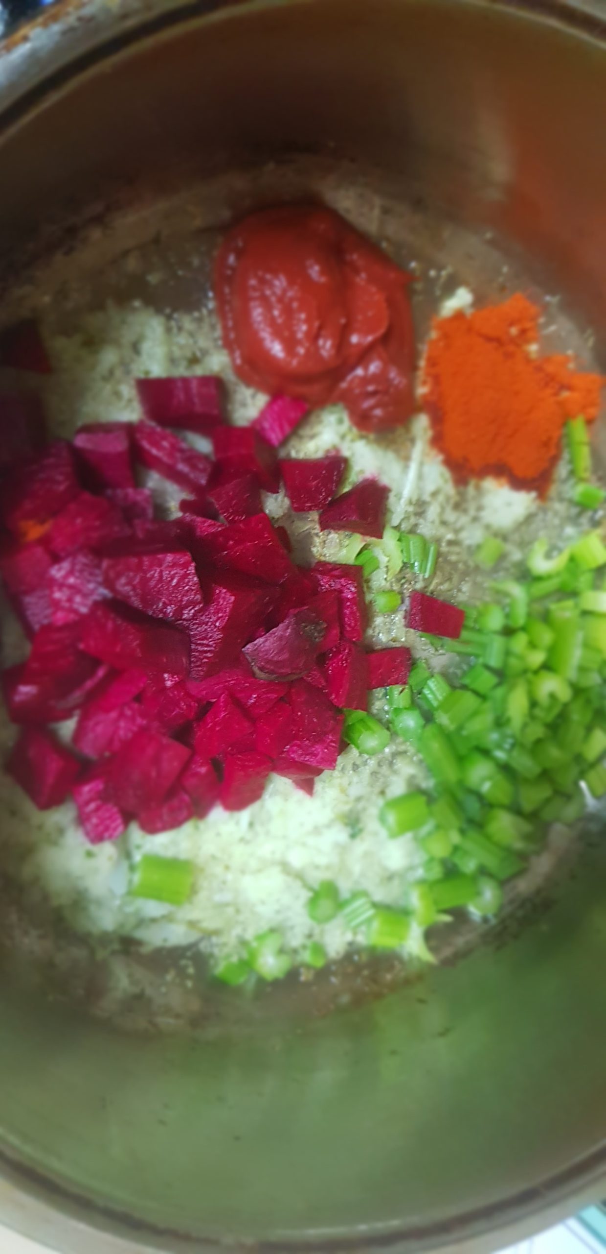 Préparez la soupe : faites chauffer l’huile dans une grande casserole à feu doux-moyen. Ajouter les oignons hachés, faire sauter jusqu’à ce qu’ils soient translucides, ajouter le céleri, les betteraves, le paprika, le concentré de tomate et cuire, en remuant, pendant 1 à 2 minutes.