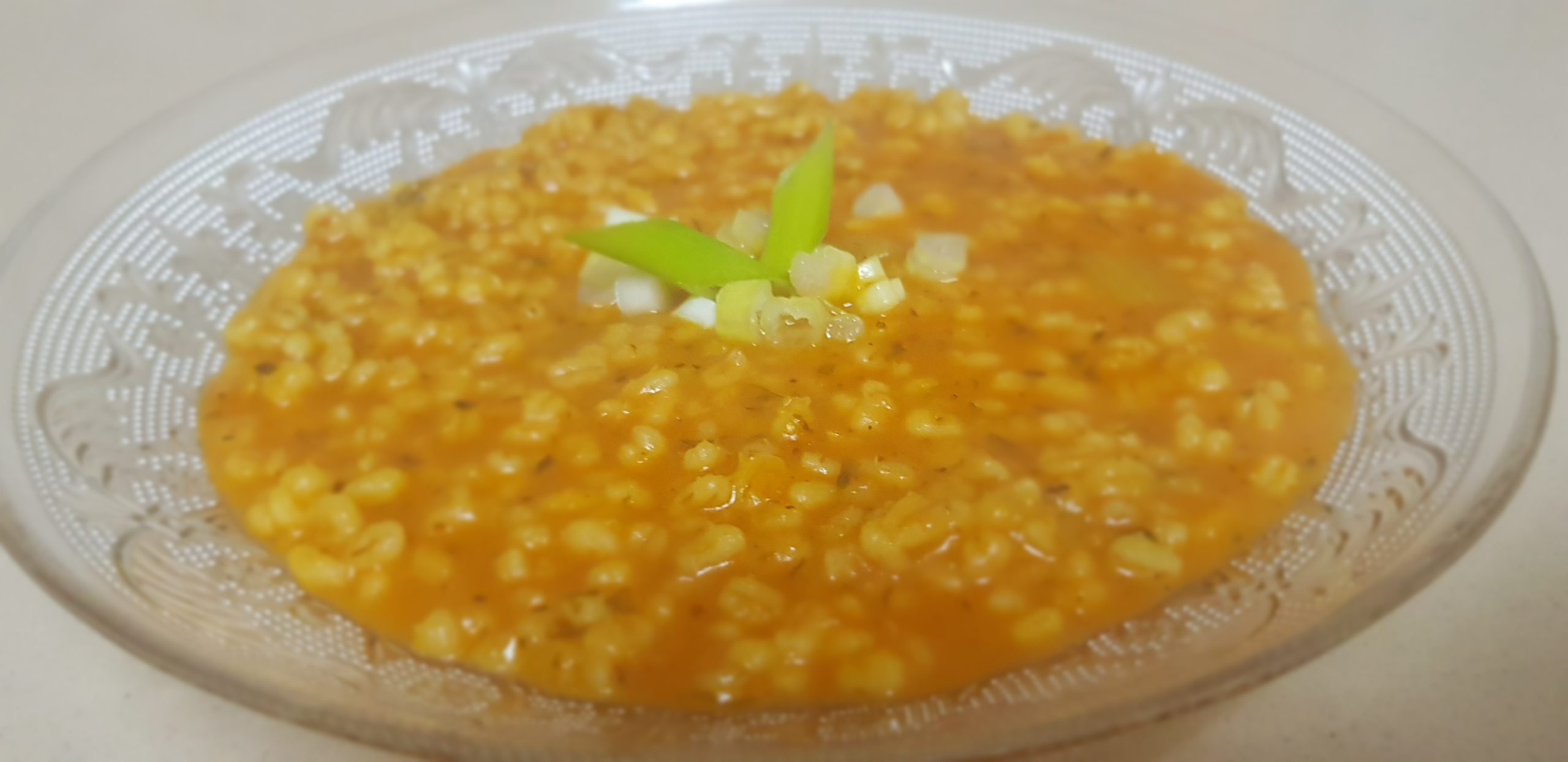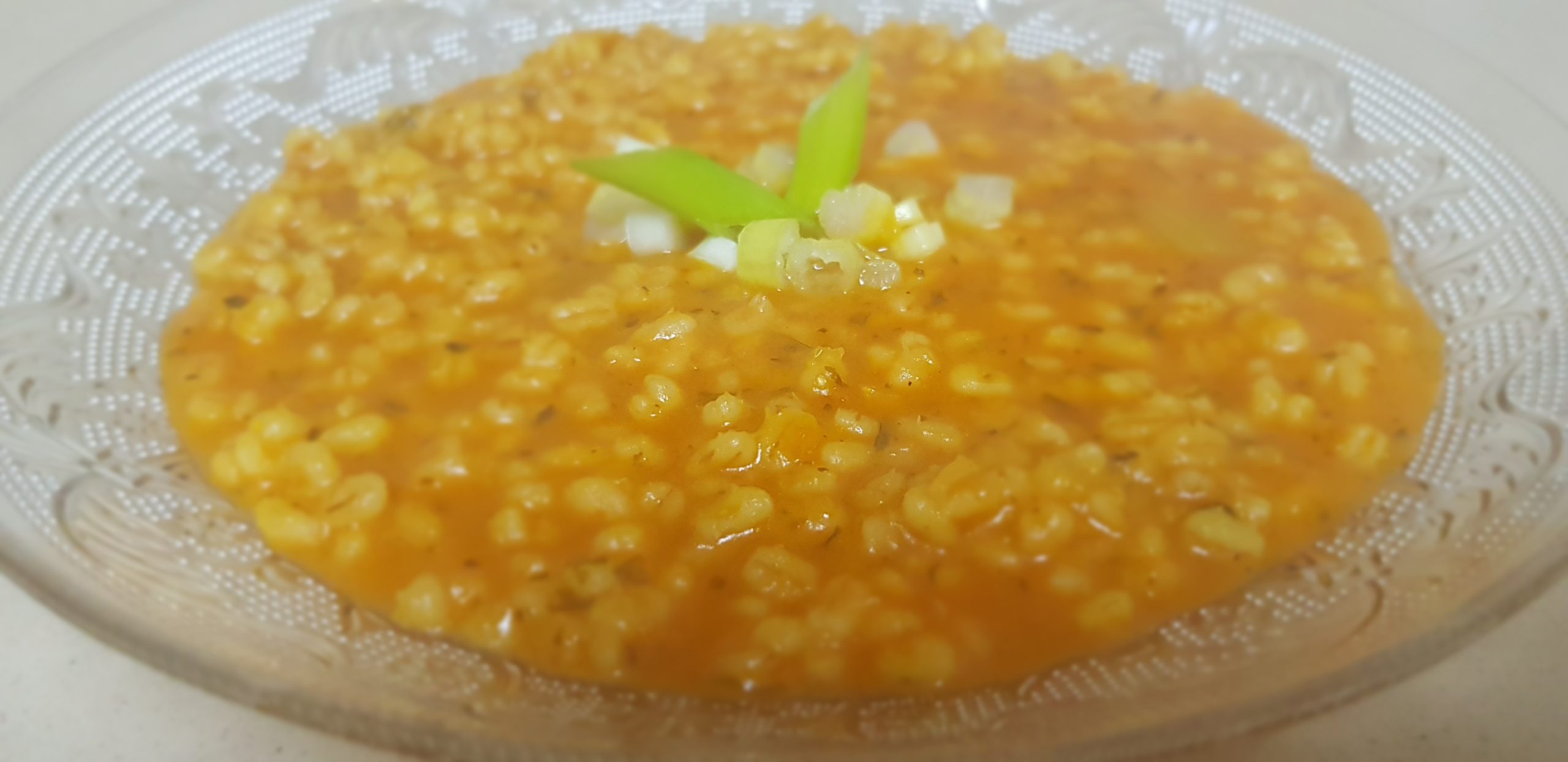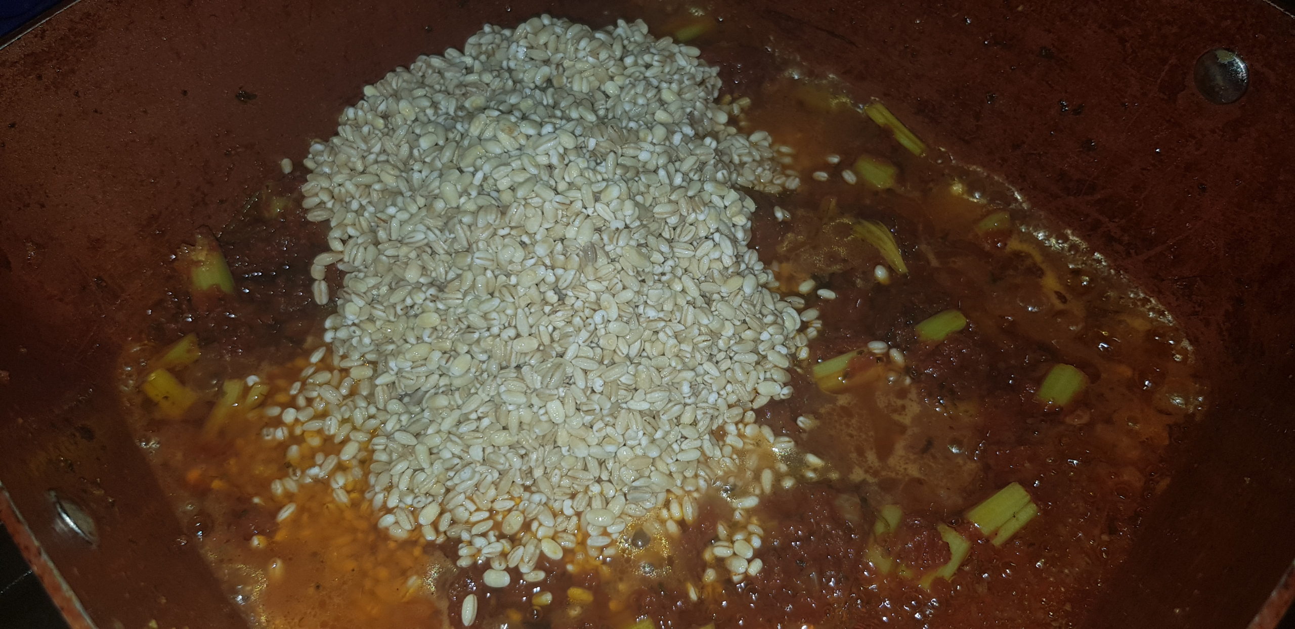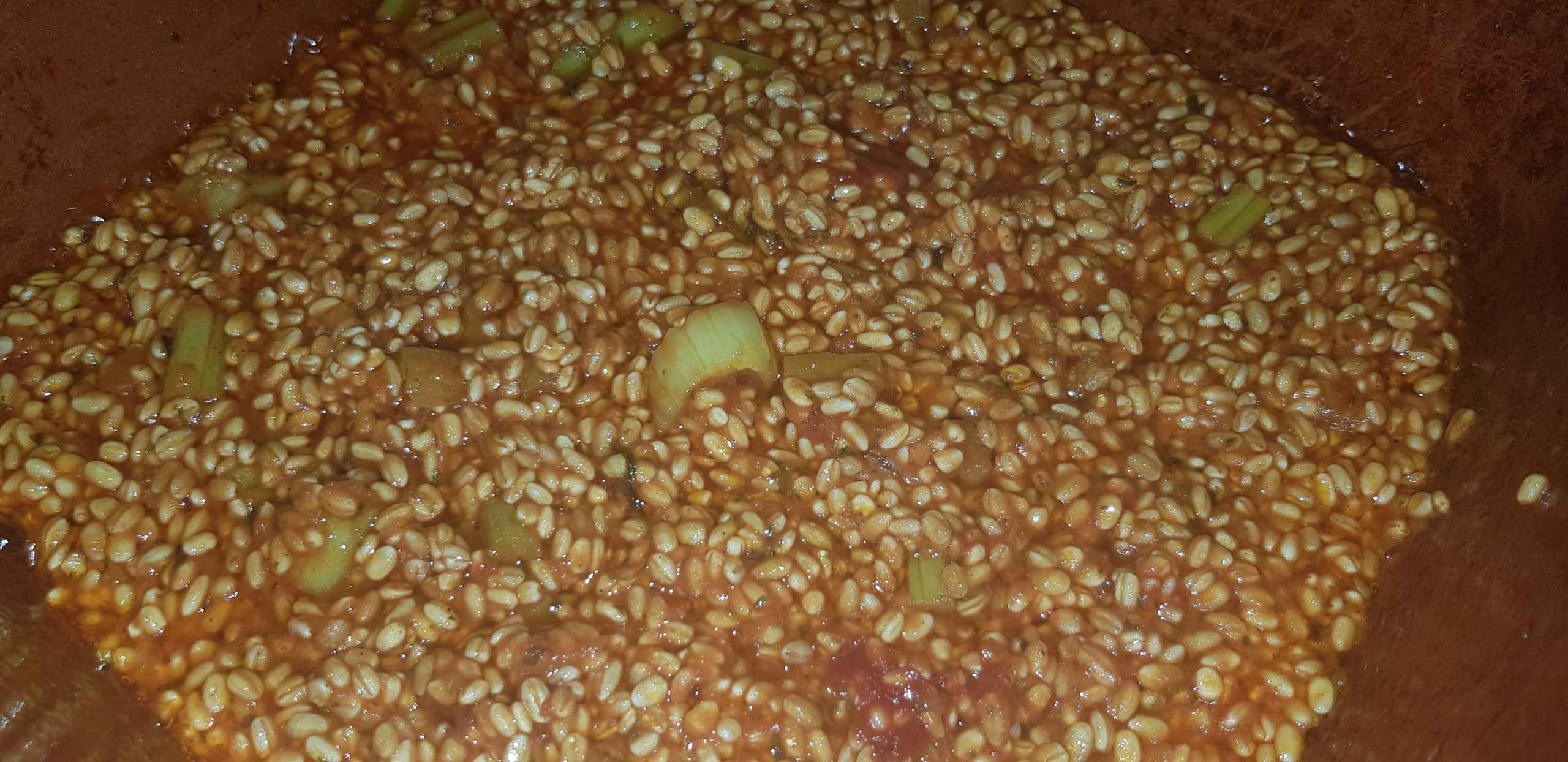 Peler les tomates, les faire fondre dans l’huile avec l’oignon émincé, mouiller d’eau et ajouter l’orge lavée. Saler, poivrer et laisser cuire lentement 1 heure à 1 heure 30. Soupe pas trop épaisse.