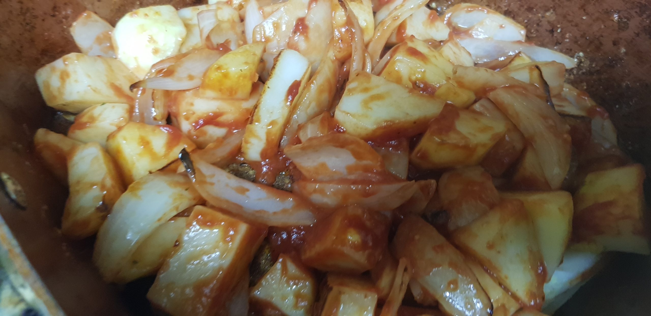 Faire revenir les oignons et les pommes de terres avec l’huile d’olive pendant 6 minutes et ensuite ajouter le concentré de tomate, faire cuire encore 6 minutes.