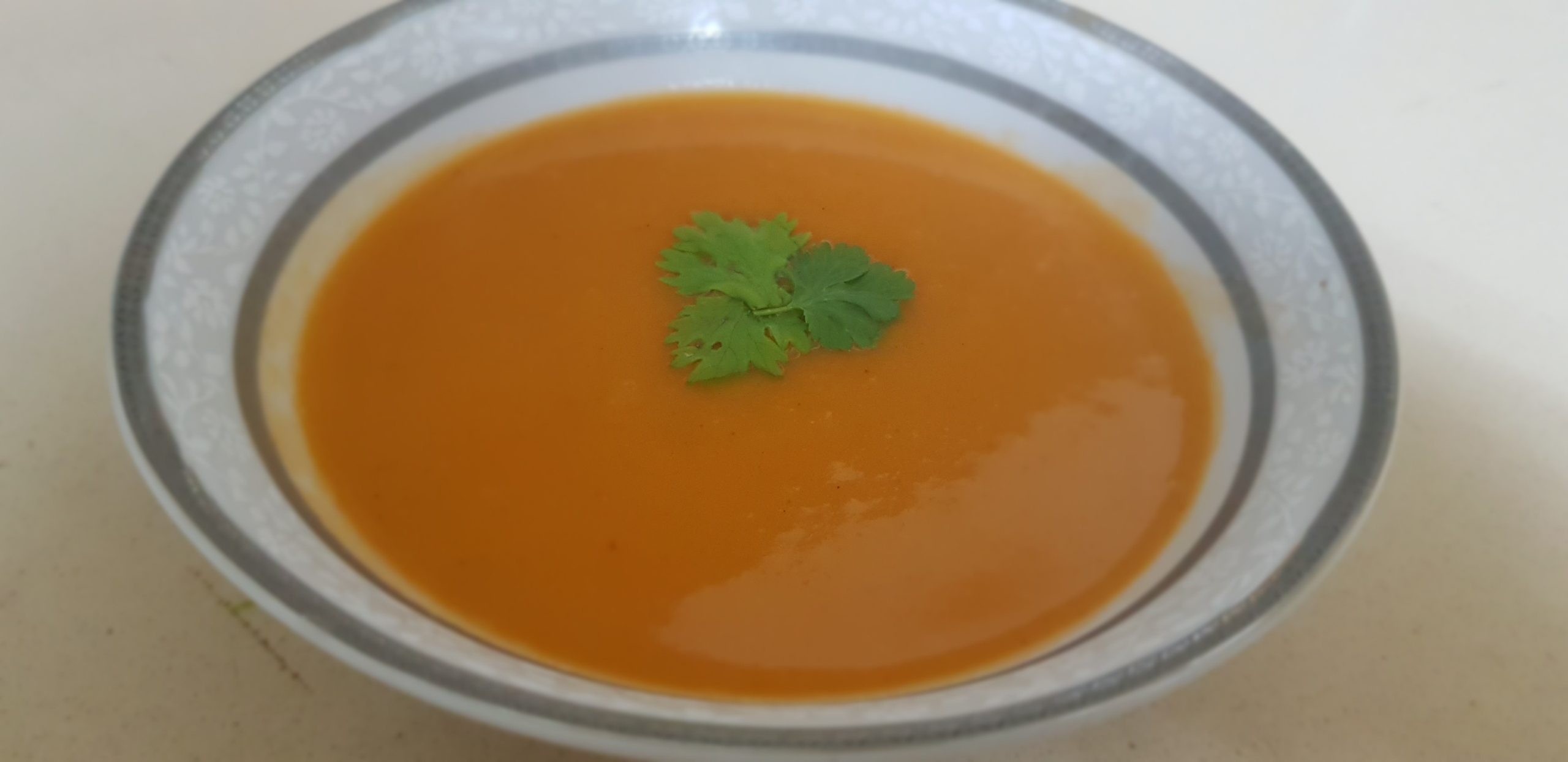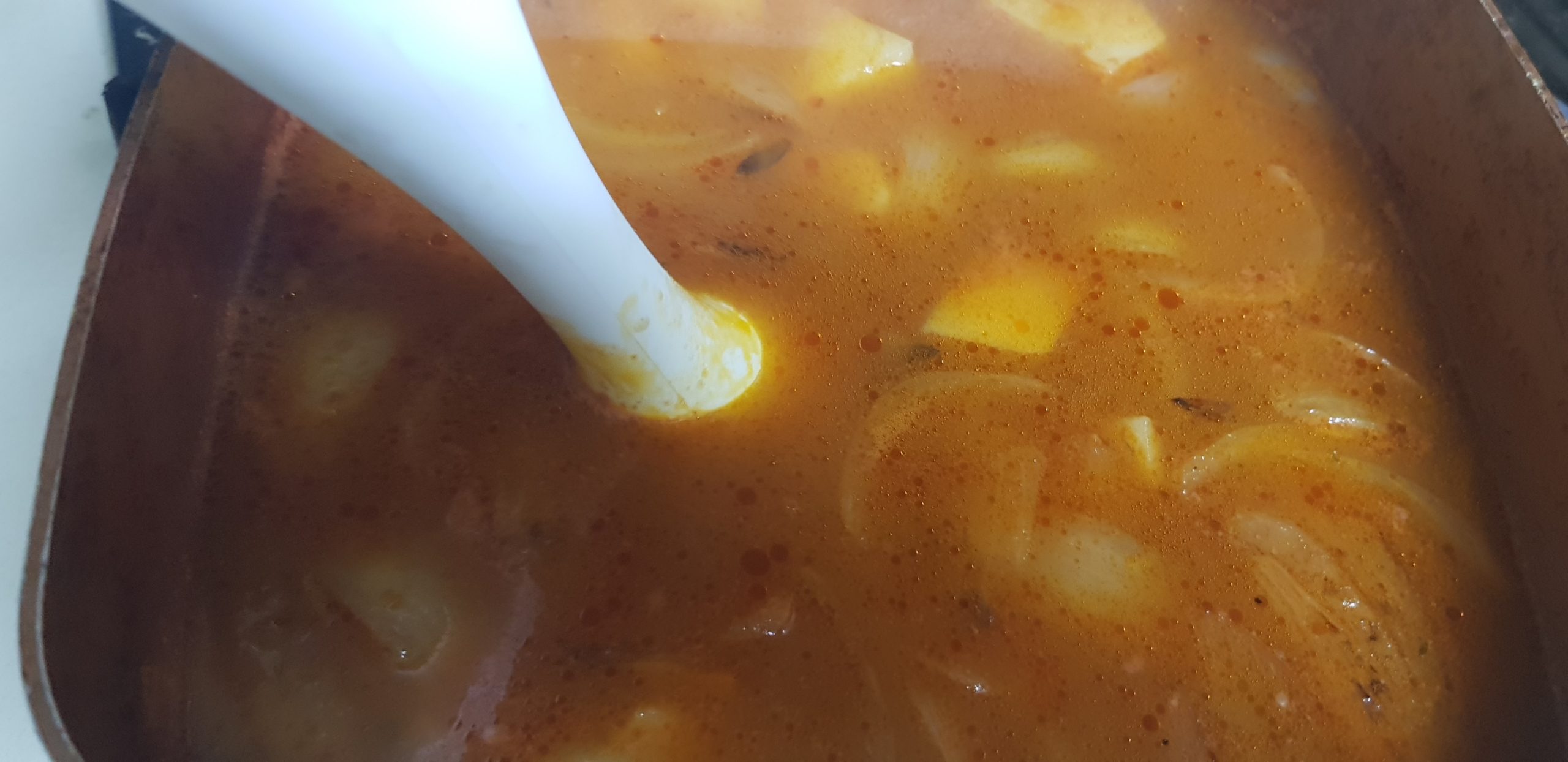 Ajouter les épices, puis de l’eau jusqu’au dessus du contenant et laisser cuire jusqu’à que les pommes de terres soient cuite et mixer !
