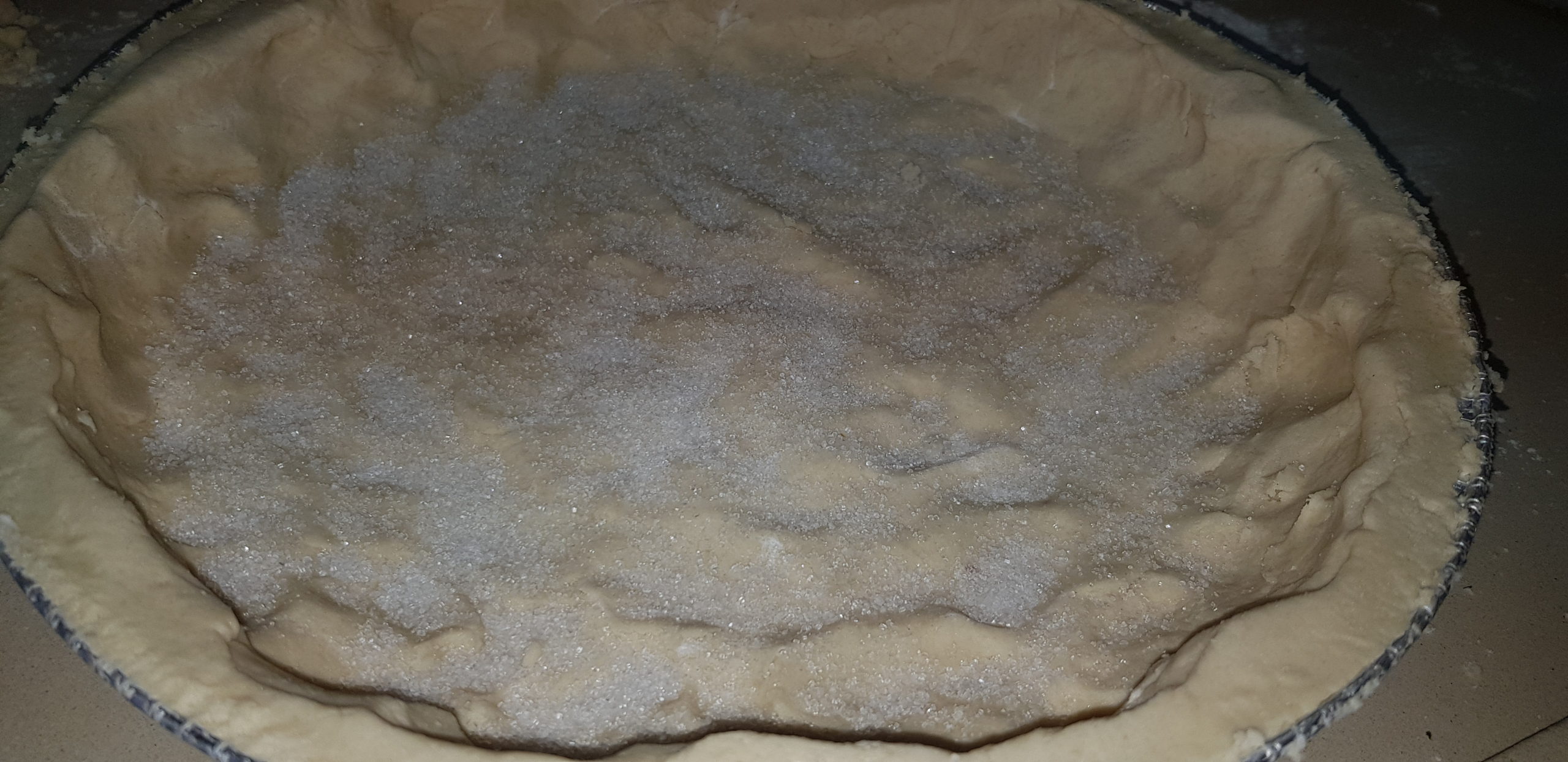Foncer un cercle de pâte sucrée aux amandes (moi je le fait avec les doigts car la pâte est très fragile) . Passer la bordure à la pince et sucrer légèrement le fond de la tarte. On peut également étaler dans le fond de la mie de génoise ou de la chapelure. Faire cuire (190 degrés, pendant 15 minutes) la tarte en bas du four jusqu’au blanchiment en vérifiant que le font de la tarte soit doré .