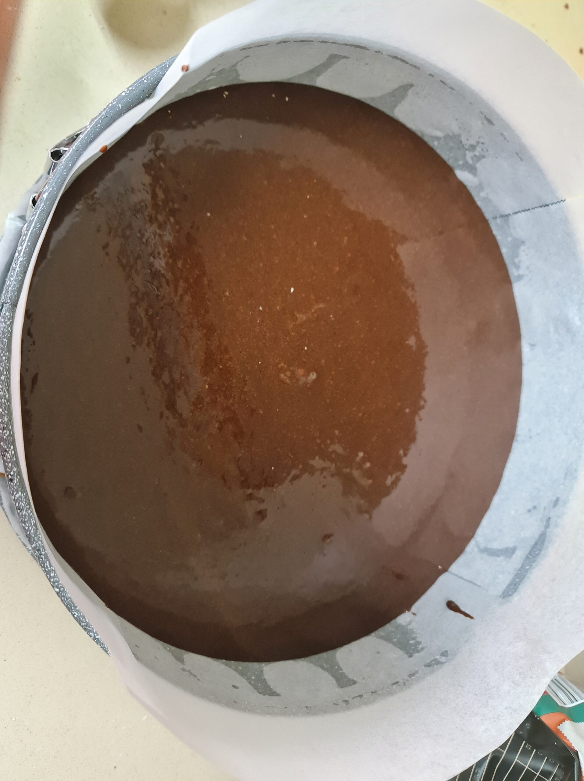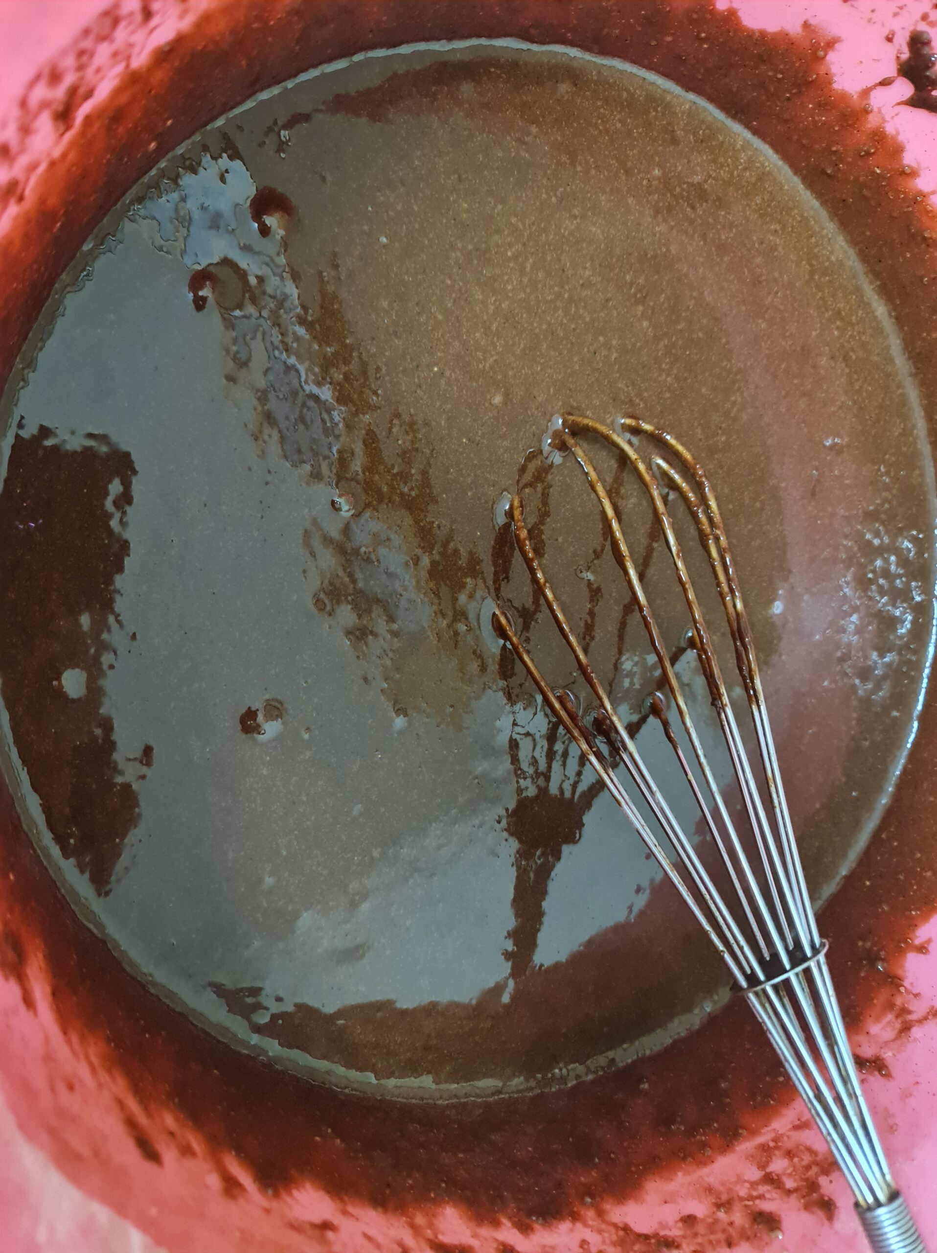 Chauffez le four à 170-175 degrés (pas de turbo !). Mettre tous les ingrédients secs dans un bol et mélanger jusqu’à ce qu’il n’y ait plus de grumeaux. Ajouter l’eau bouillante et l’huile et mélanger pour obtenir une pâte lisse, ne pas trop mélanger