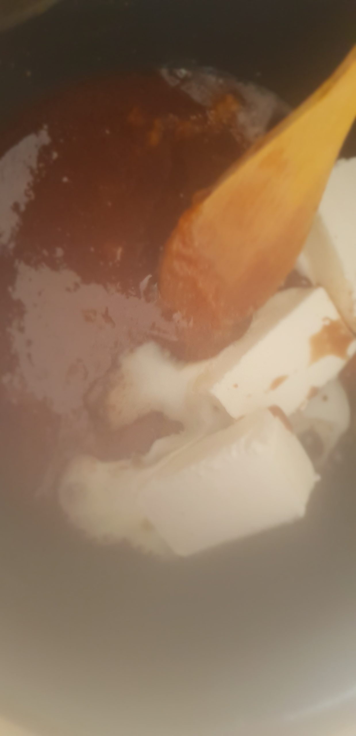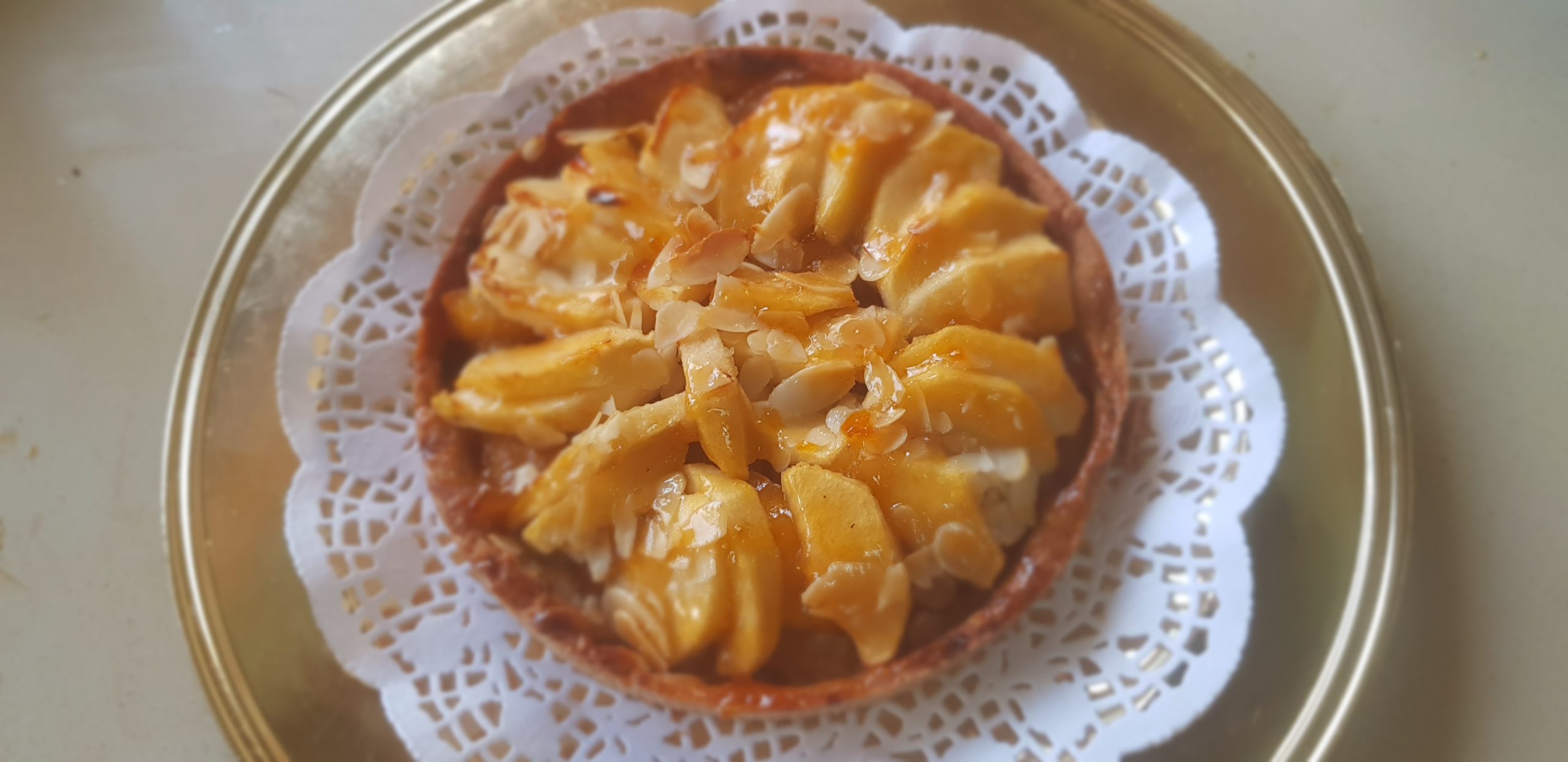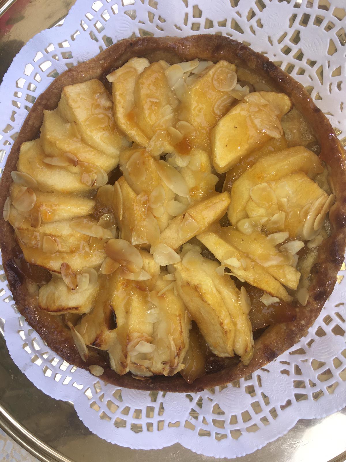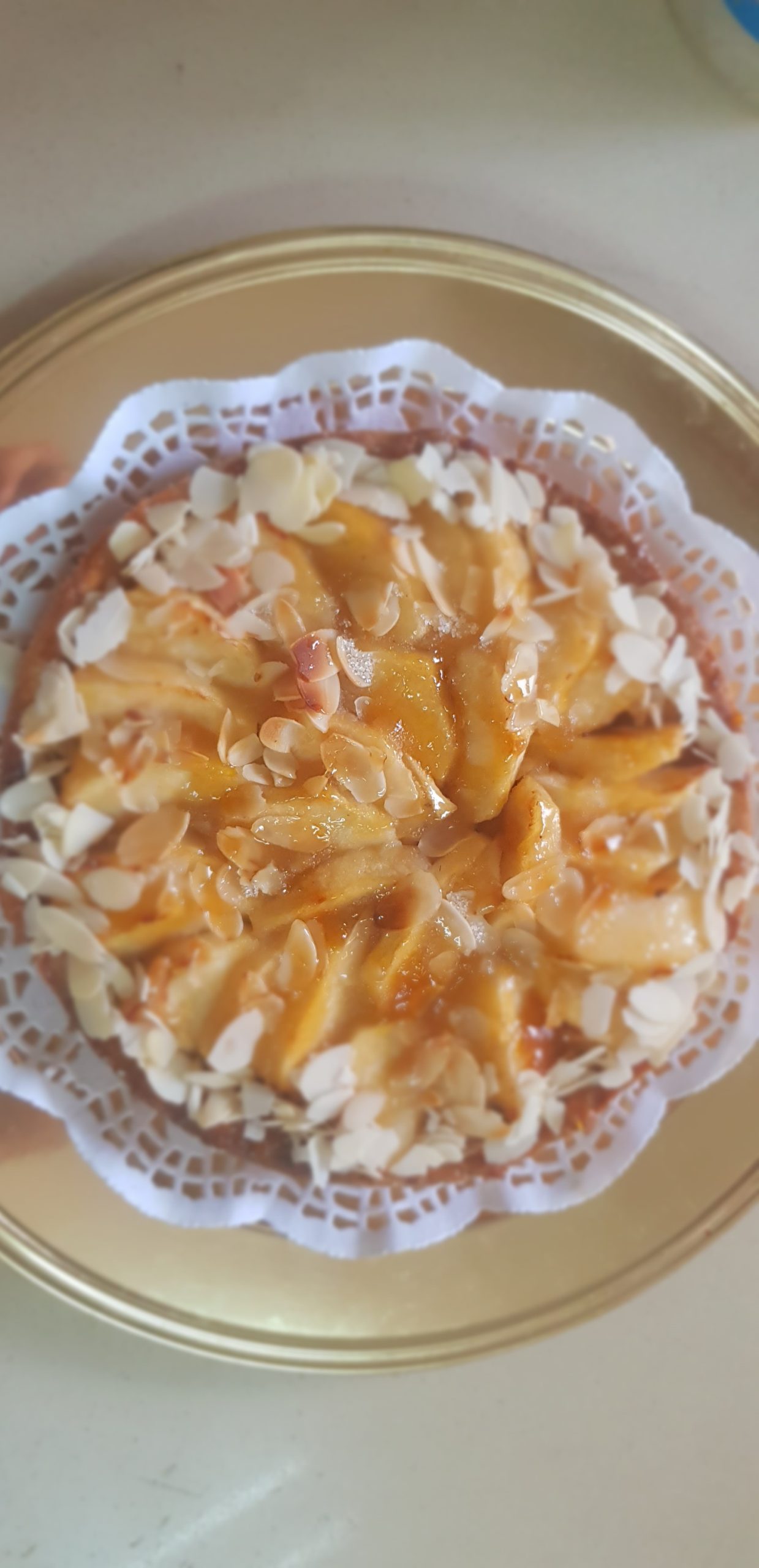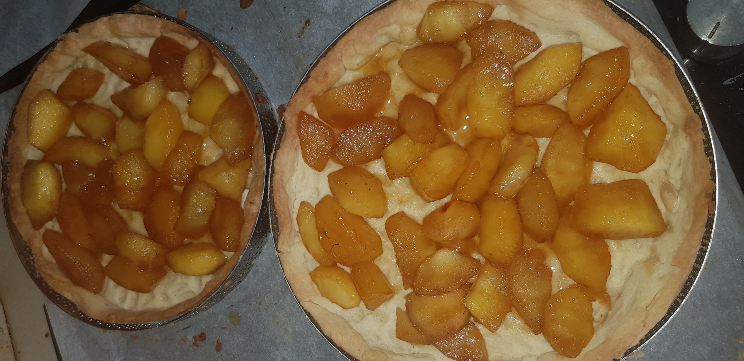 Les 3 pommes sont coupées en tranches égales et fines. Versez la garniture aux pommes au caramel dans la tarte à moitié préparée en aplatissant bien mais doucement. Disposez par dessus, les tranches de pomme sur la farce ( en forme d’éventail).